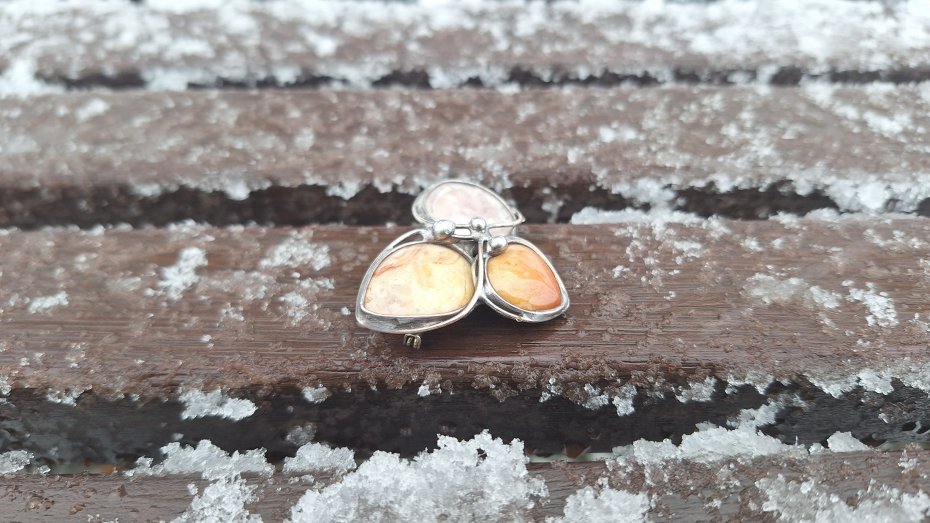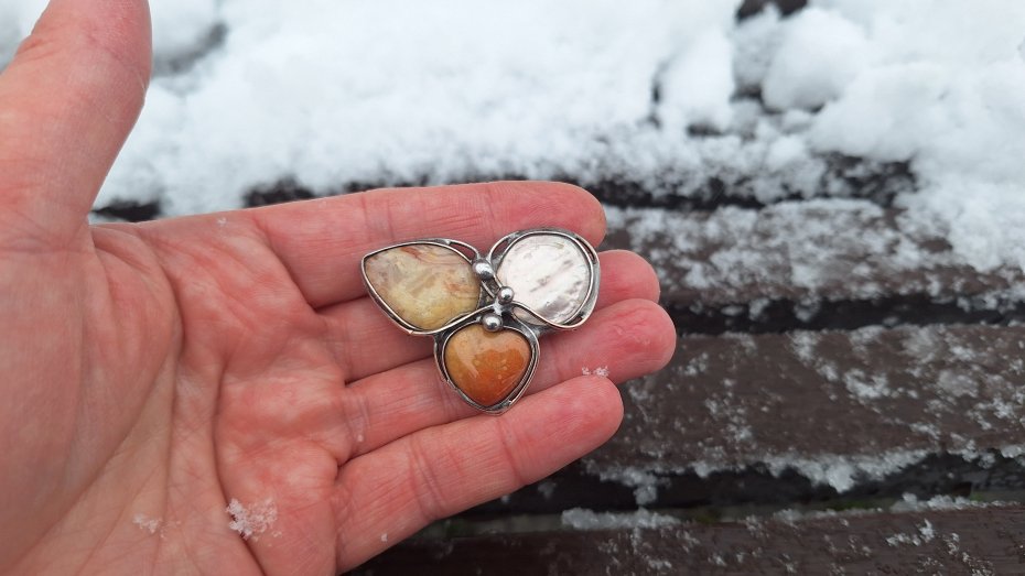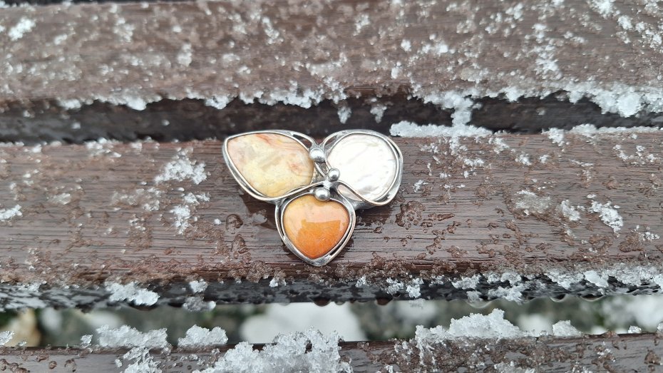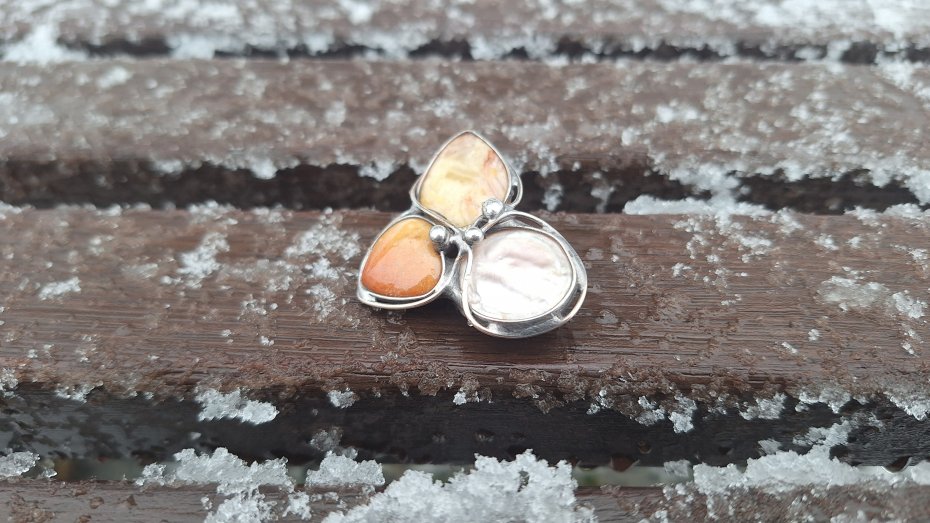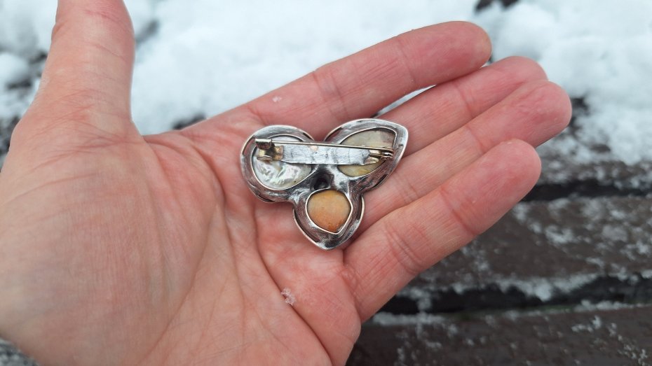 Broszka wykonana z miedzi, cyny, perły, agatu i koralowca. Wymiary ok. 4.5 na 3.5 cm. Zapięcie metalowe.
