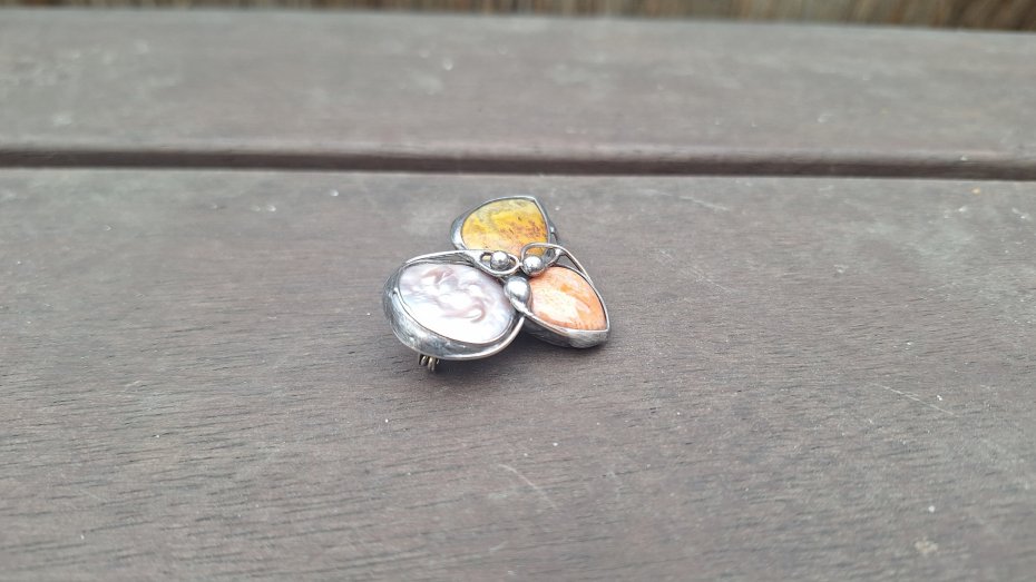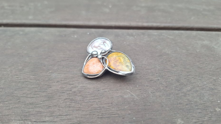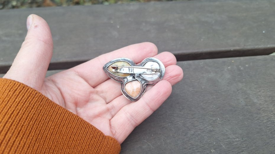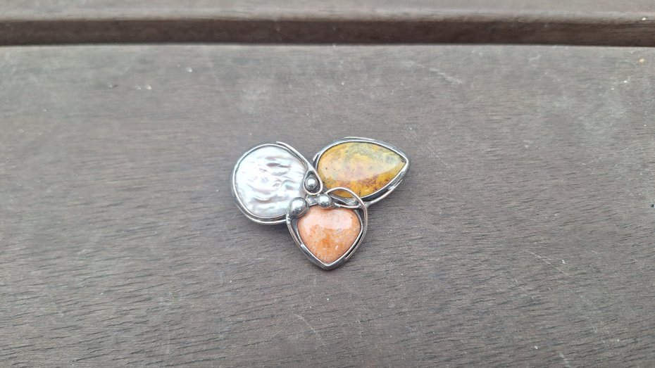 Broszka wykonana z miedzi, cyny, perły, agatu i koralowca. Wymiary ok. 4.5 na 3.3 cm. Zapięcie metalowe.