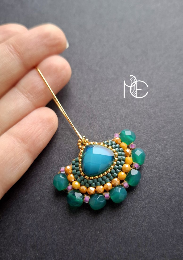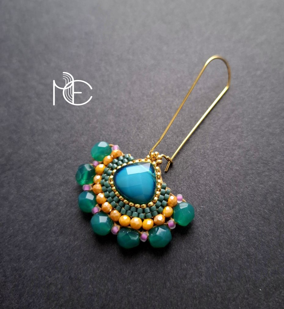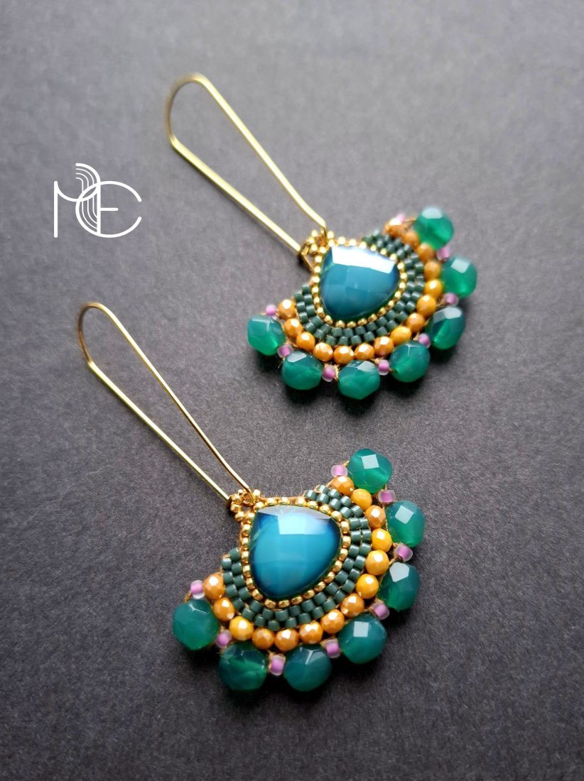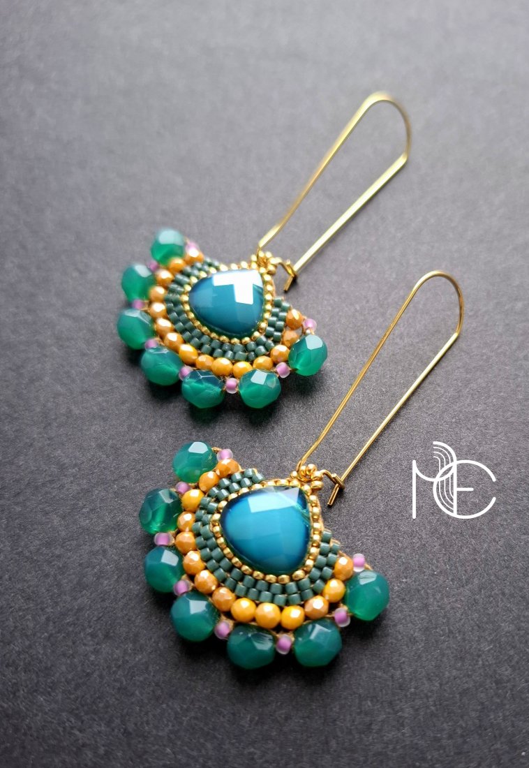 Długie kolczyki wiszące na prostych, pozłacanych biglach; wykonane techniką swoistego haftu drobnymi szklanymi jak i kryształowymi koralikami. Dwustronne podwieszone na pozłacanych i nieuczulających biglach. Wymiary: długość wraz z zapięciem - 6,5 cm, szerokość max. 3,7 cm. Wykonane w jedynym egzemplarzu.