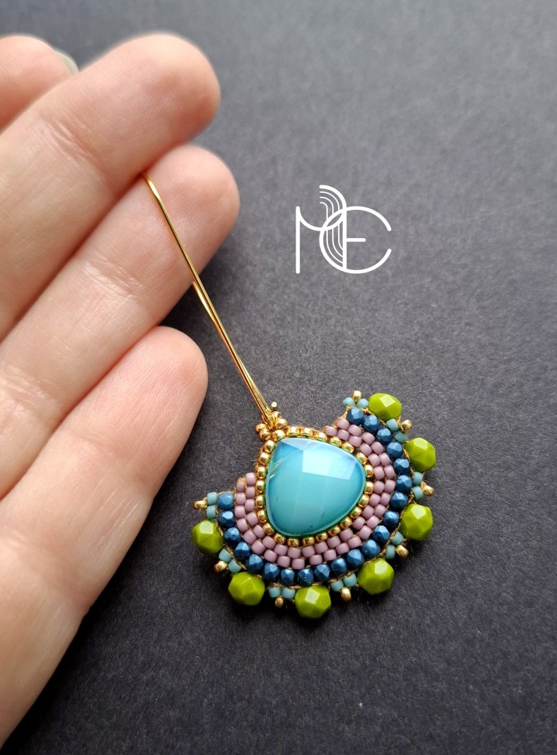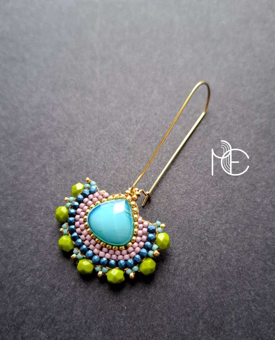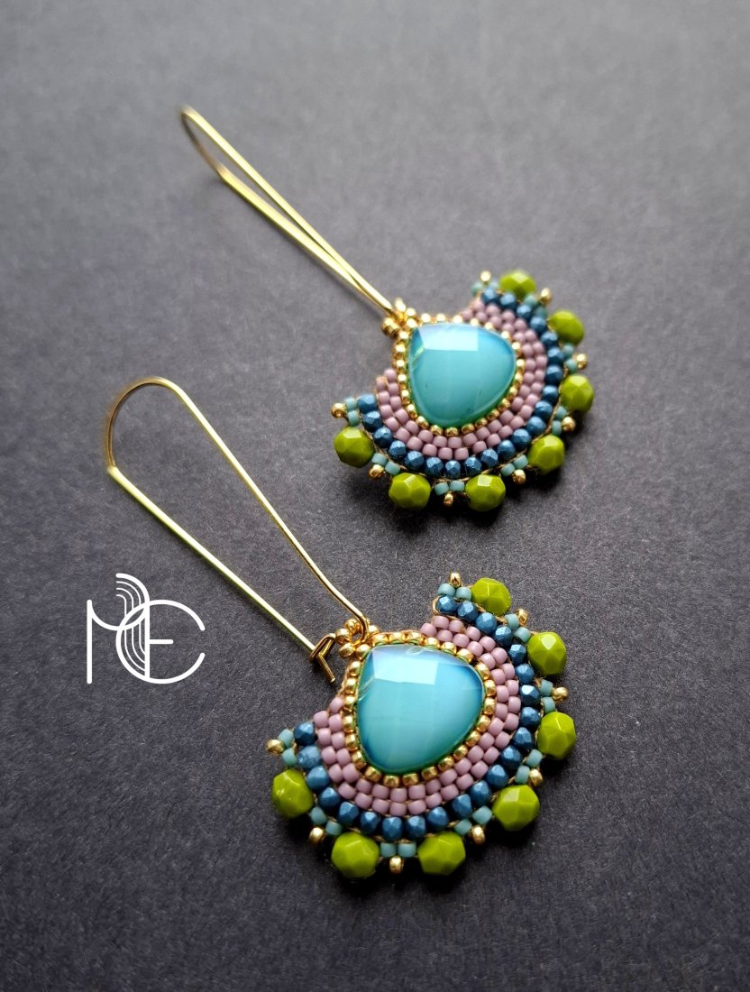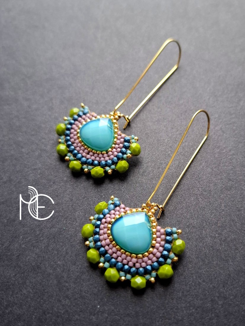 Długie kolczyki wiszące na prostych, pozłacanych biglach; wykonane techniką swoistego haftu drobnymi szklanymi jak i kryształowymi koralikami. Dwustronne podwieszone na pozłacanych i nieuczulających biglach. Wymiary: długość wraz z zapięciem - 6,3 cm, szerokość max. 3 cm. Wykonane w jedynym egzemplarzu.