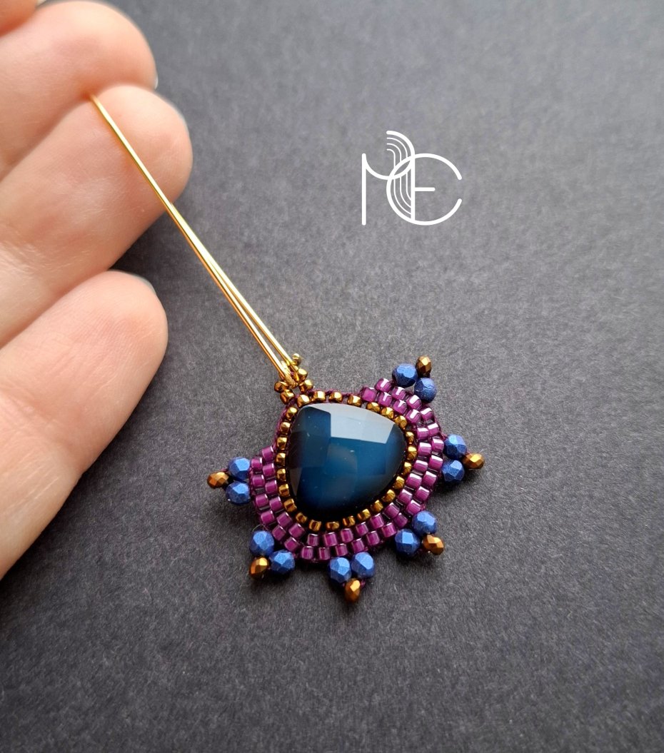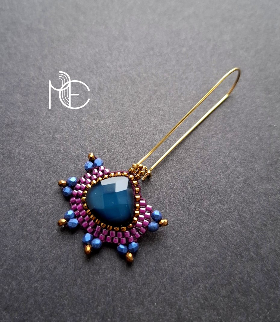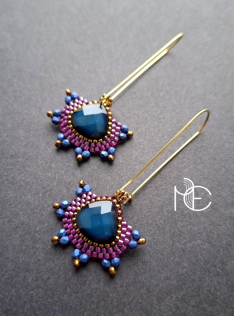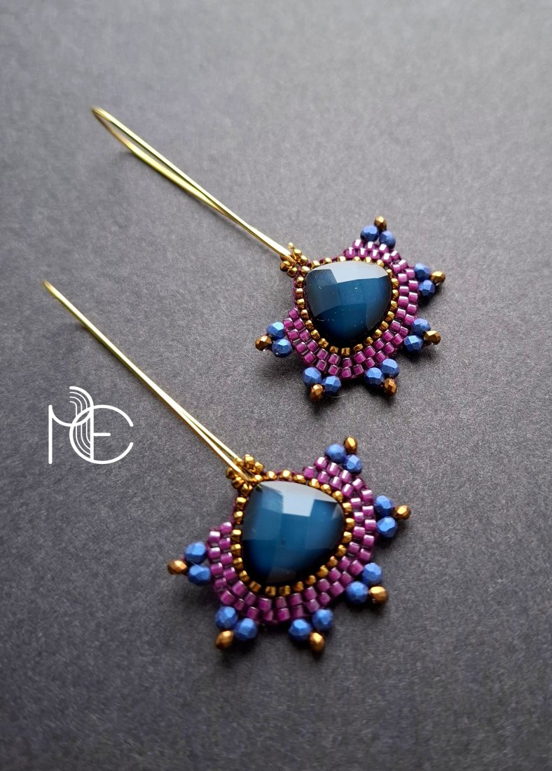 Długie kolczyki wiszące na prostych, pozłacanych biglach; wykonane techniką swoistego haftu drobnymi szklanymi jak i kryształowymi koralikami. Dwustronne podwieszone na pozłacanych i nieuczulających biglach. Wymiary: długość wraz z zapięciem - 6,1 cm, szerokość max. 2,8 cm. Wykonane w jedynym egzemplarzu.