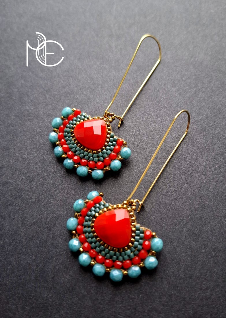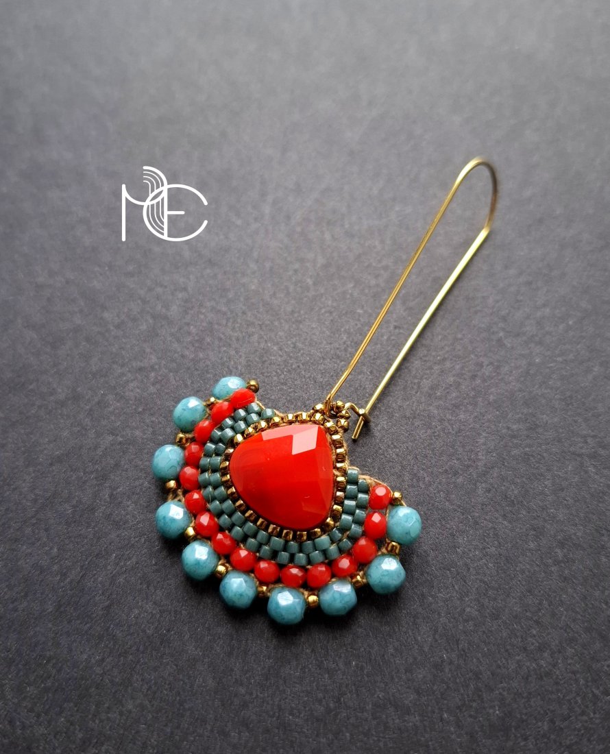 Długie kolczyki wiszące na prostych, pozłacanych biglach; wykonane techniką swoistego haftu drobnymi szklanymi jak i kryształowymi koralikami. Dwustronne podwieszone na pozłacanych i nieuczulających biglach. Wymiary: długość wraz z zapięciem - 6,2 cm, szerokość max. 3,2 cm. Wykonane w jedynym egzemplarzu.