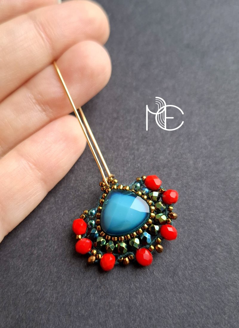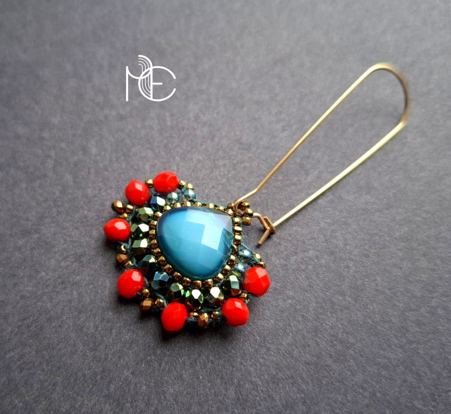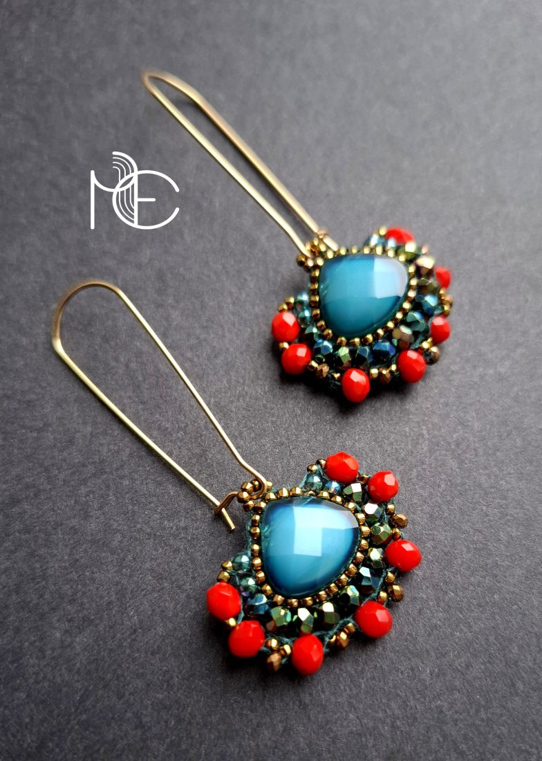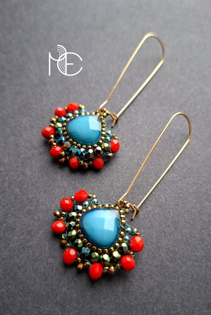 Długie kolczyki wiszące na prostych, pozłacanych biglach; wykonane techniką swoistego haftu drobnymi szklanymi jak i kryształowymi koralikami. Dwustronne podwieszone na pozłacanych i nieuczulających biglach. Wymiary: długość wraz z zapięciem - 6 cm, szerokość max. 3 cm. Wykonane w jedynym egzemplarzu.