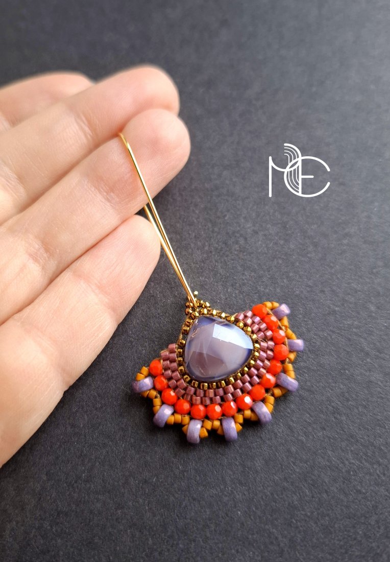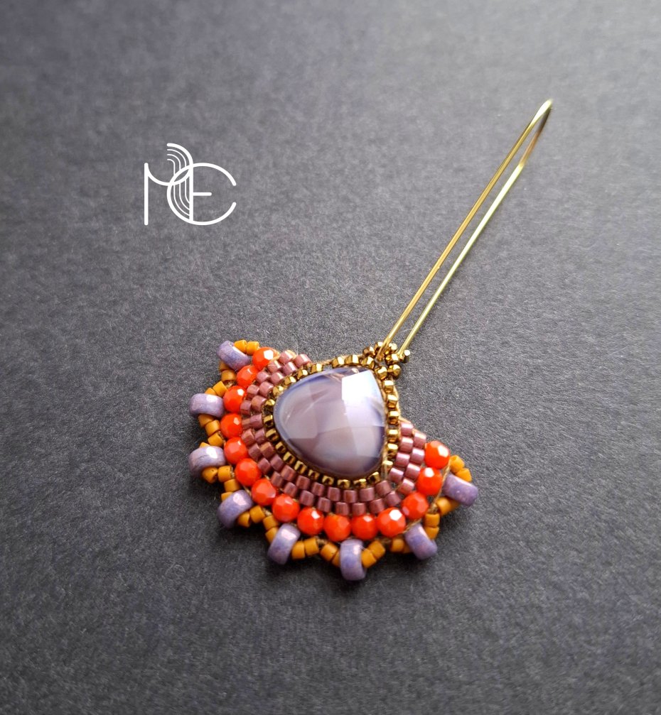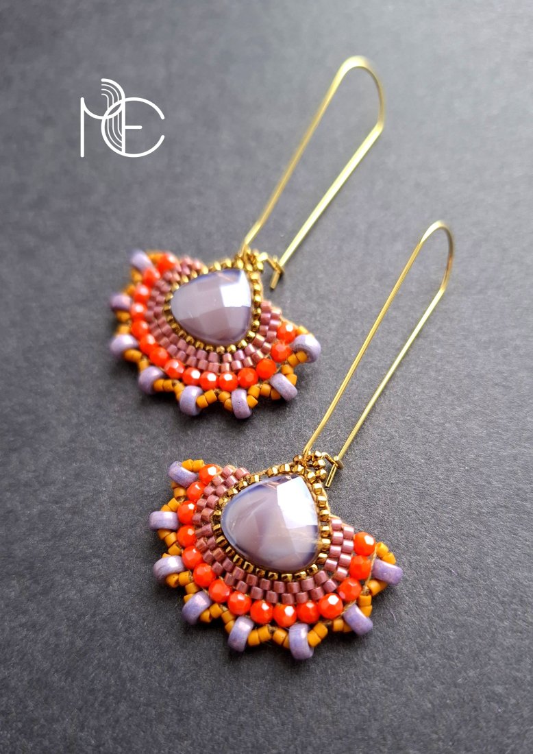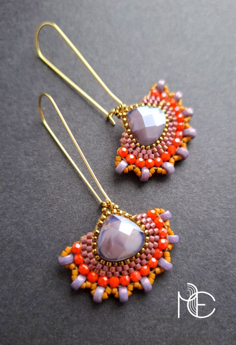 Długie kolczyki wiszące na prostych, pozłacanych biglach; wykonane techniką swoistego haftu drobnymi szklanymi jak i kryształowymi koralikami. Dwustronne podwieszone na pozłacanych i nieuczulających biglach. Wymiary: długość wraz z zapięciem - 6,8 cm, szerokość max. 3,8 cm. Wykonane w jedynym egzemplarzu.
