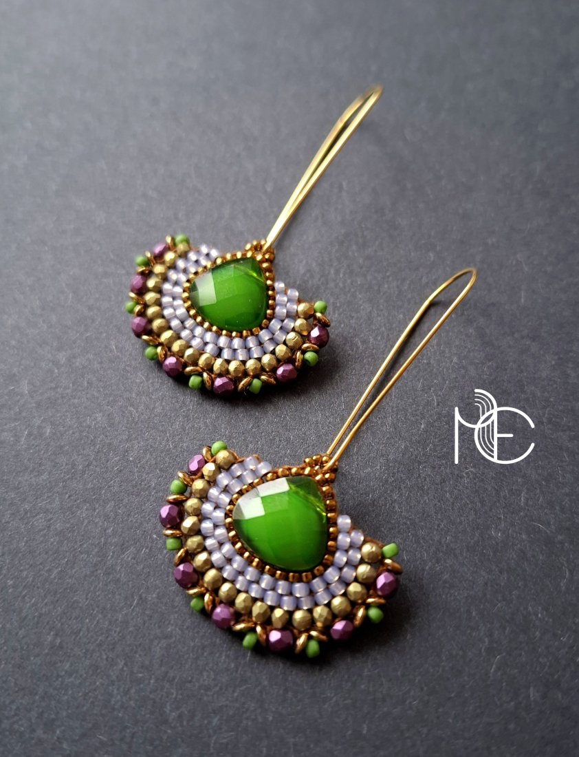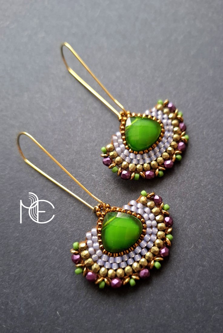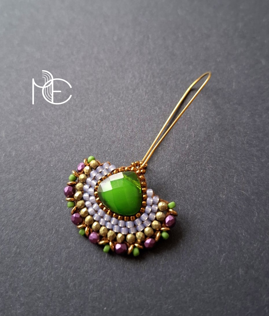 Długie kolczyki wiszące na prostych, pozłacanych biglach; wykonane techniką swoistego haftu drobnymi szklanymi jak i kryształowymi koralikami w połączeniu z hematytami platerowanymi. Dwustronne podwieszone na pozłacanych i nieuczulających biglach. Wymiary: długość wraz z zapięciem - 6,6 cm, szerokość max. 3,8 cm. Wykonane w jedynym egzemplarzu.