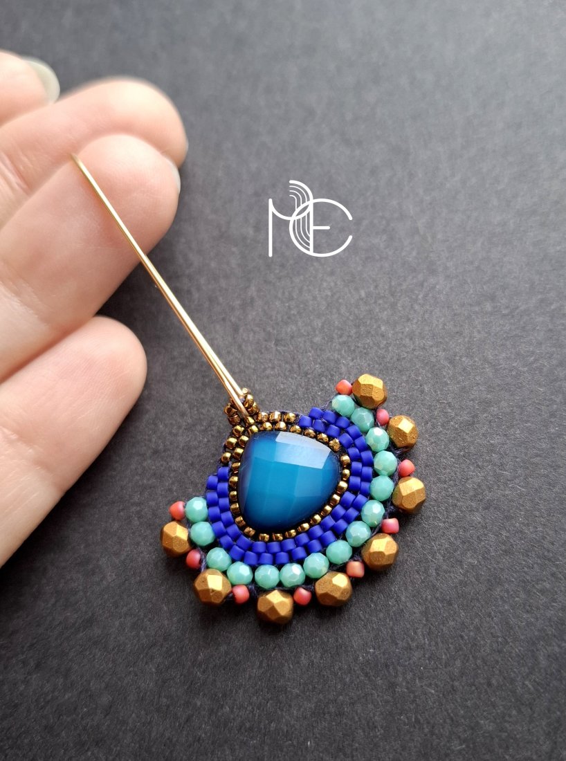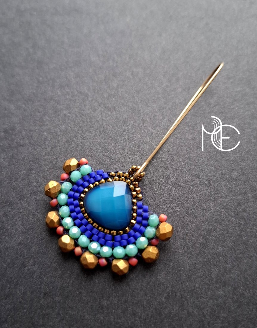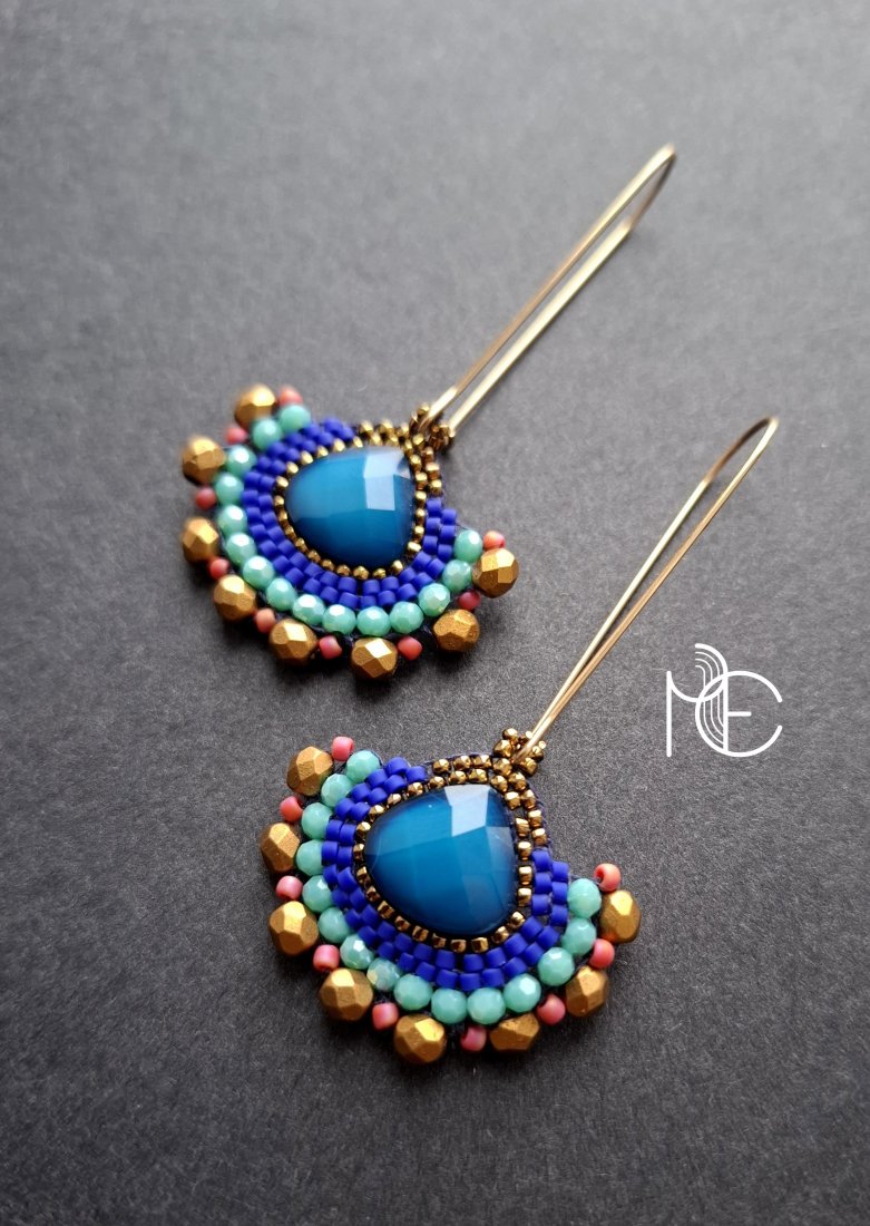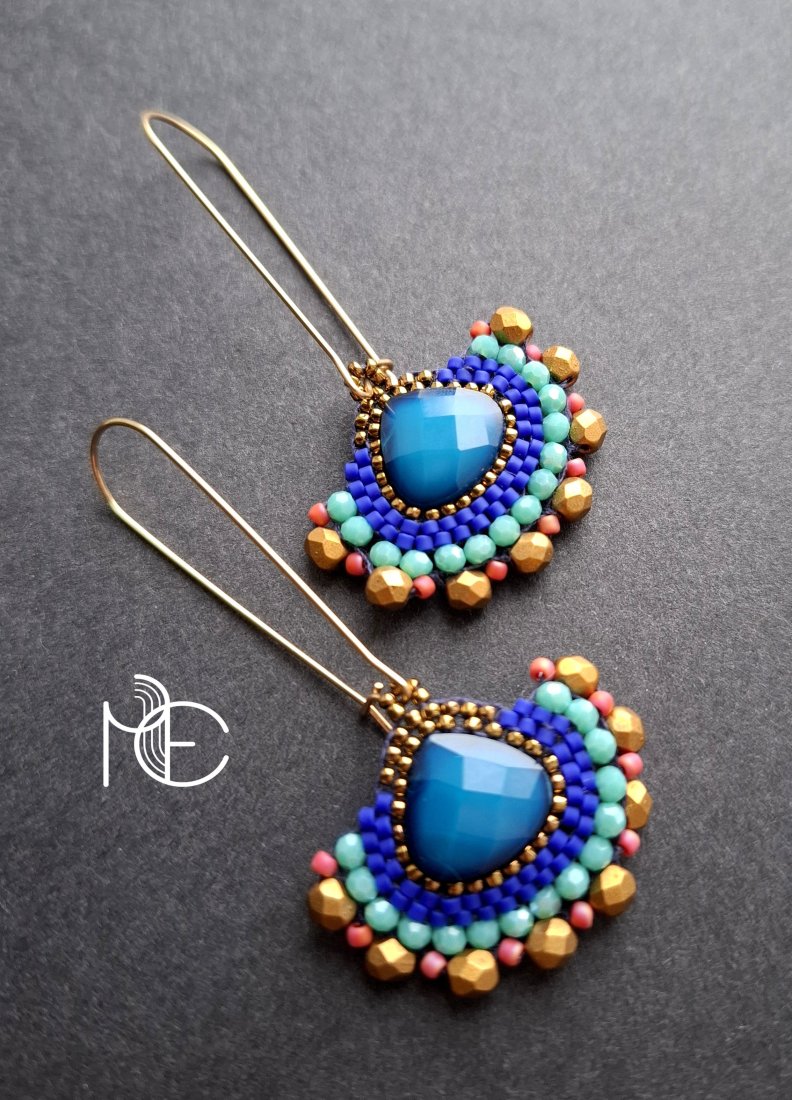Długie kolczyki wiszące na prostych, pozłacanych biglach; wykonane techniką swoistego haftu drobnymi szklanymi jak i kryształowymi koralikami. Dwustronne podwieszone na pozłacanych i nieuczulających biglach. Wymiary: długość wraz z zapięciem - 6,5 cm, szerokość max. 3,3 cm. Wykonane w jedynym egzemplarzu.