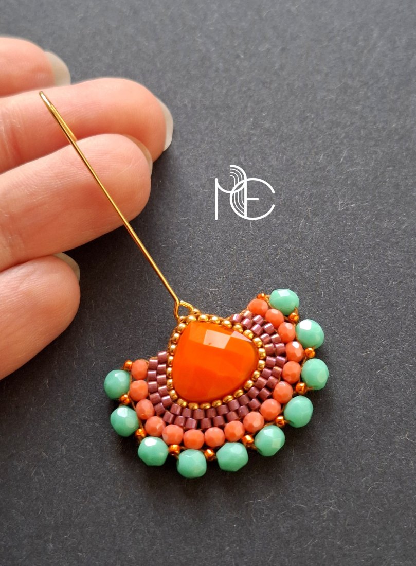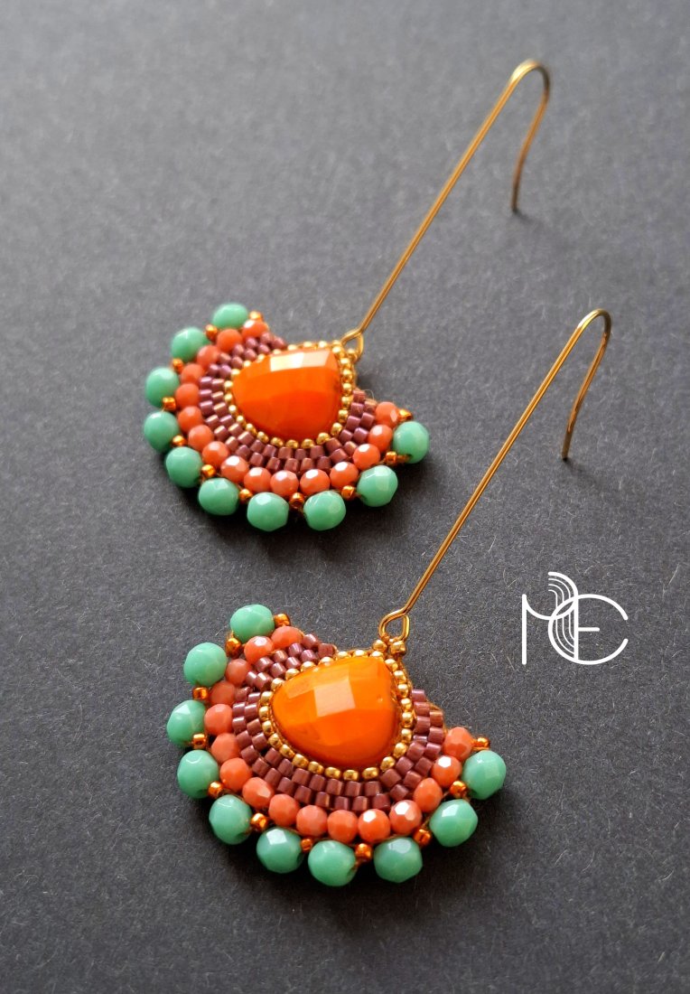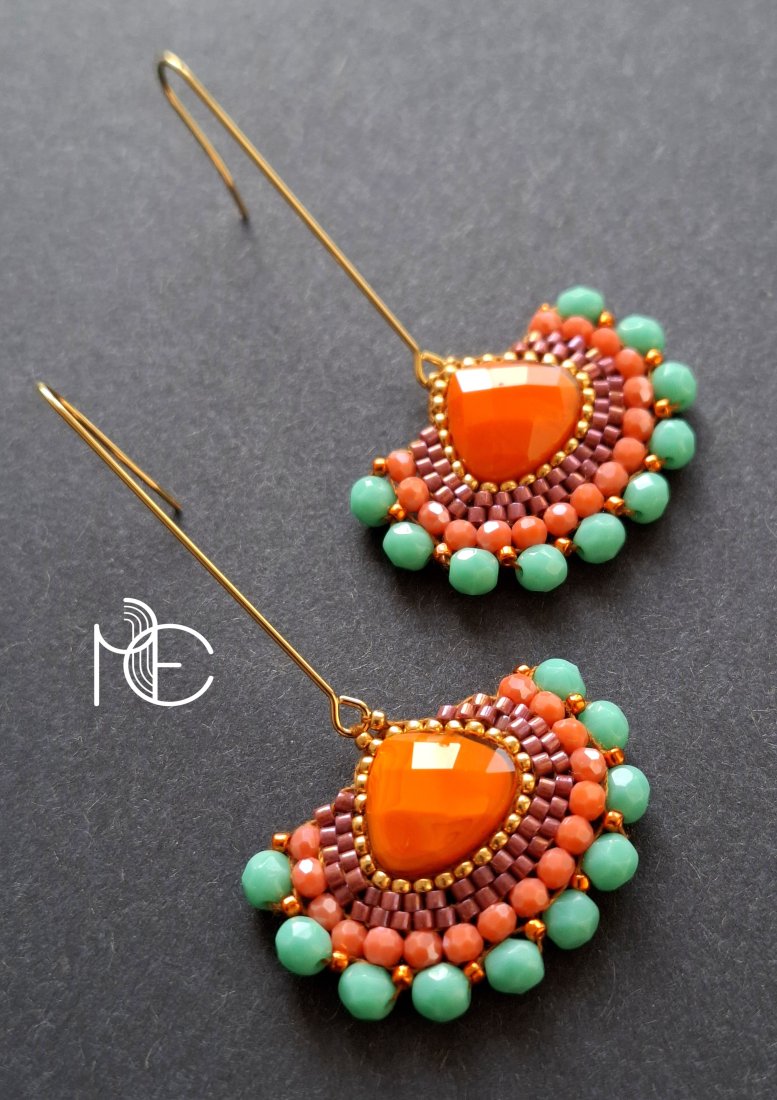 Długie kolczyki wiszące na prostych, pozłacanych biglach; wykonane techniką swoistego haftu drobnymi szklanymi jak i kryształowymi koralikami. Dwustronne podwieszone na pozłacanych i nieuczulających biglach. Wymiary: długość wraz z zapięciem - 6,3 cm, szerokość max. 3,4 cm. Wykonane w jedynym egzemplarzu.