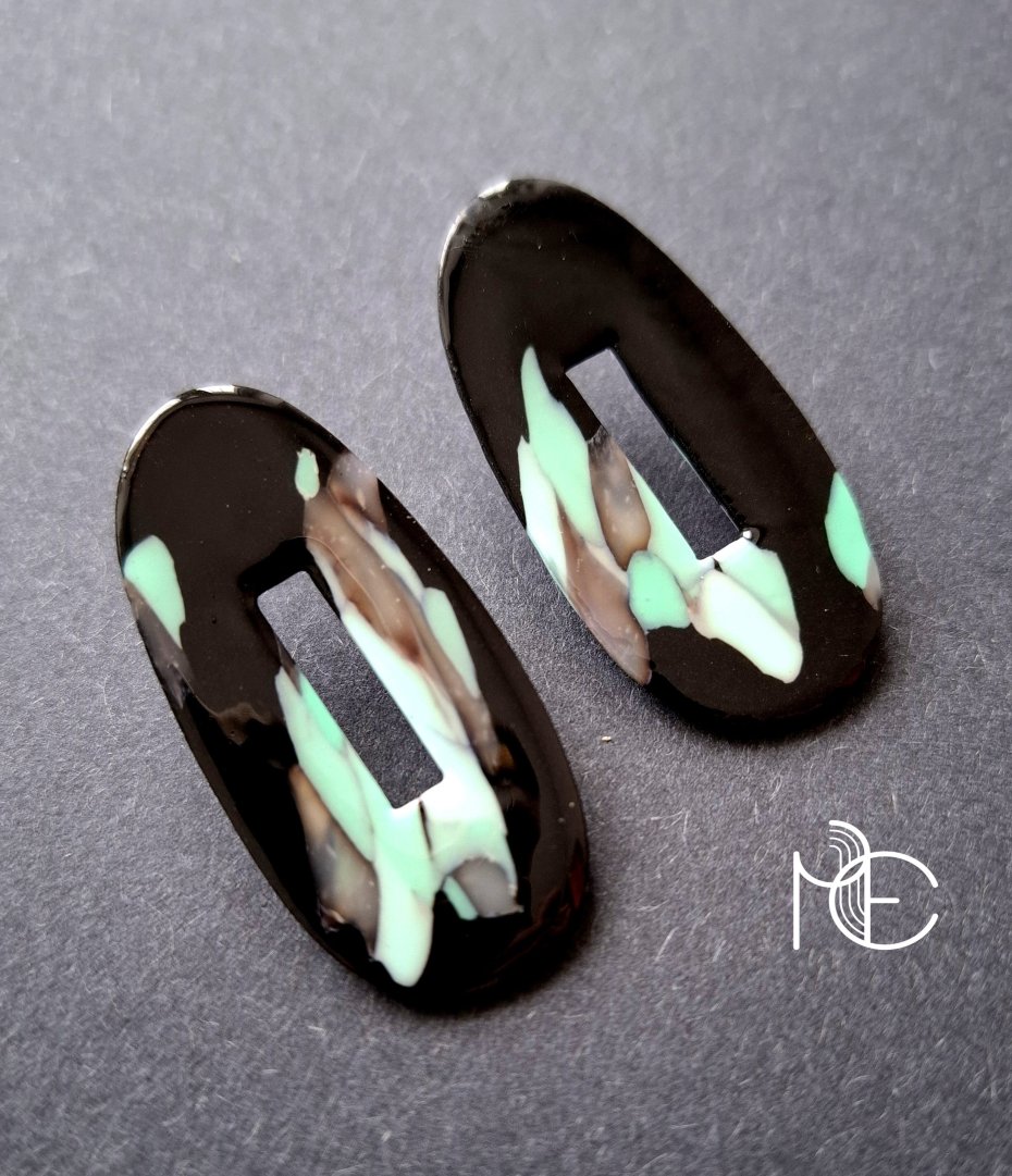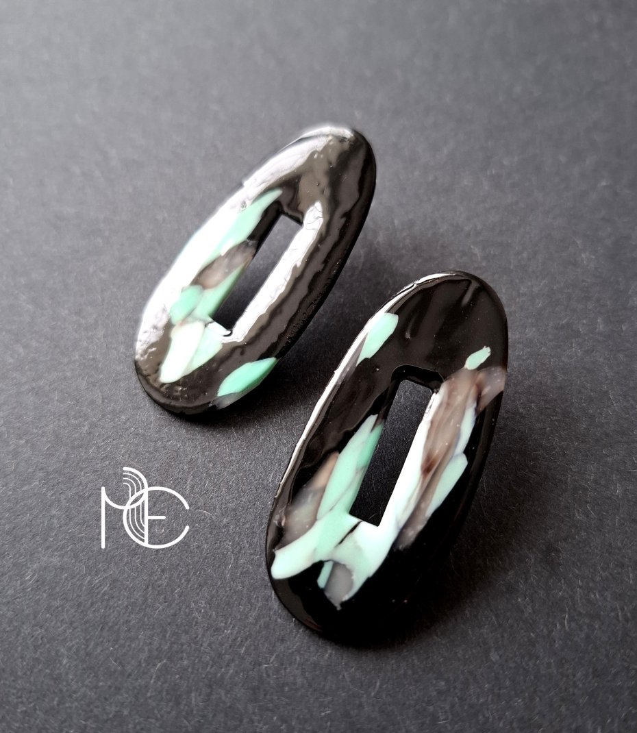 Lekkie kolczyki na sztyfty wykonane z wysokiej jakości glinki polimerowej z efektem półprzezroczystości. Jednostronne z posrebrzanymi, nieuczulającymi sztyftami. Wymiary: długość wraz z zapięciem: 4,6 cm; szerokość max. 2 cm. Wykonane w jedynym egzemplarzu.