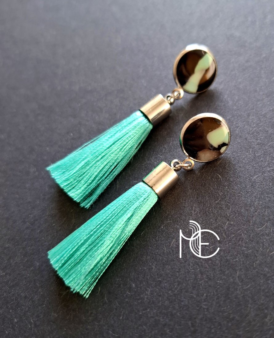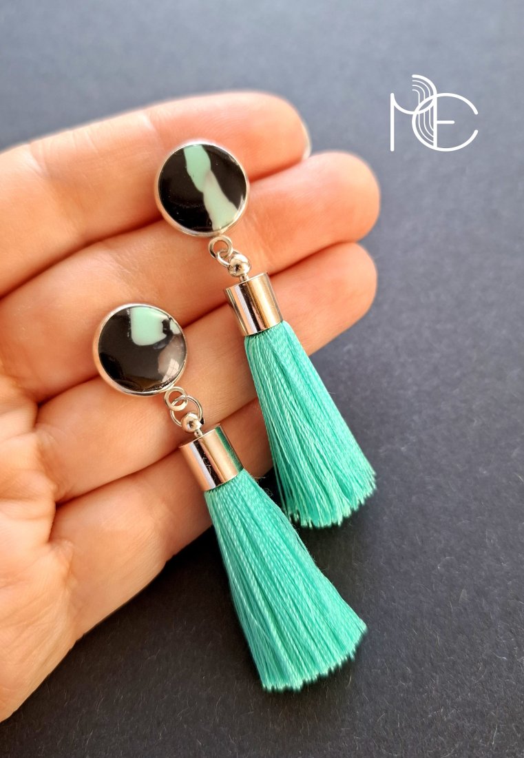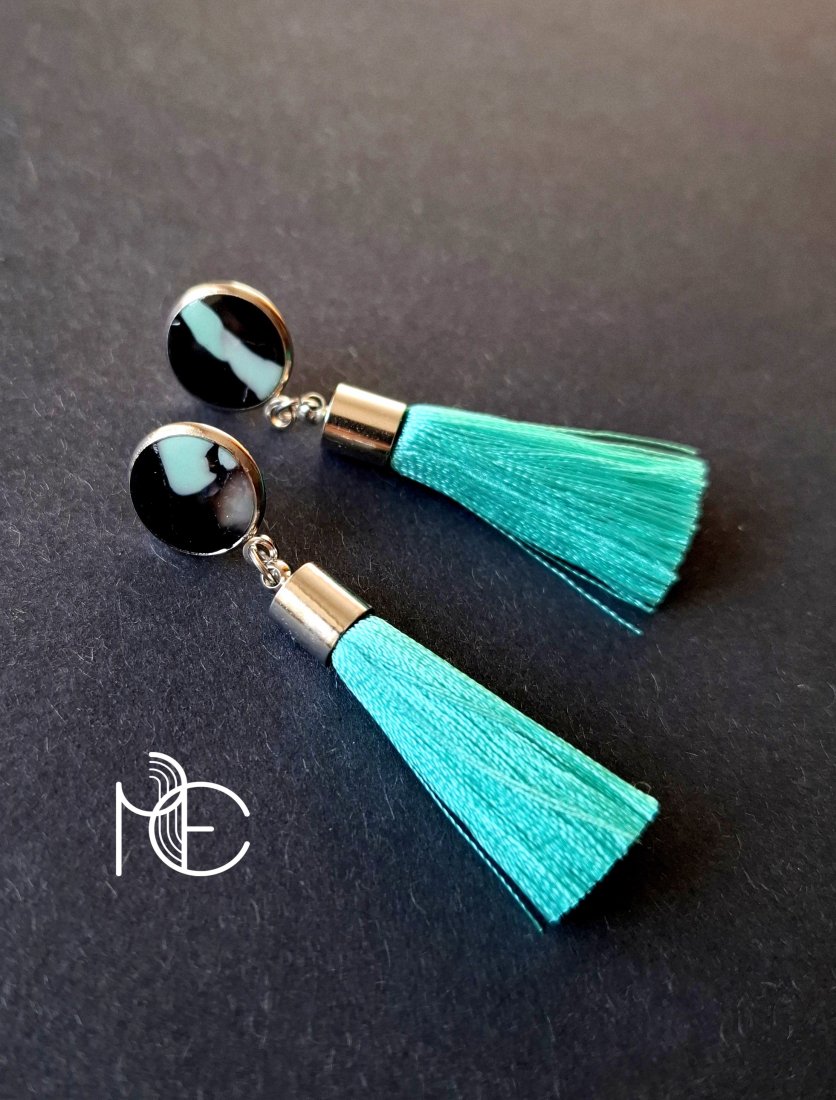 Kolczyki na sztyfty wykonane z wysokiej jakości glinki polimerowej z dodatkiem ozdobnych elementów metalowych oraz jasnoturkusowych chwostów. Jednostronne z posrebrzanymi, nieuczulającymi sztyftami. Wymiary: długość całkowita: 6 cm; szerokość max. 1,4 cm. Wykonane w jedynym egzemplarzu.