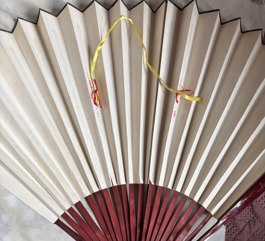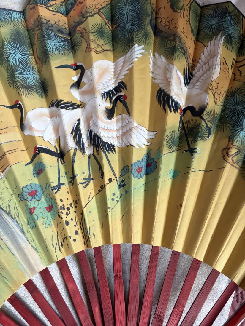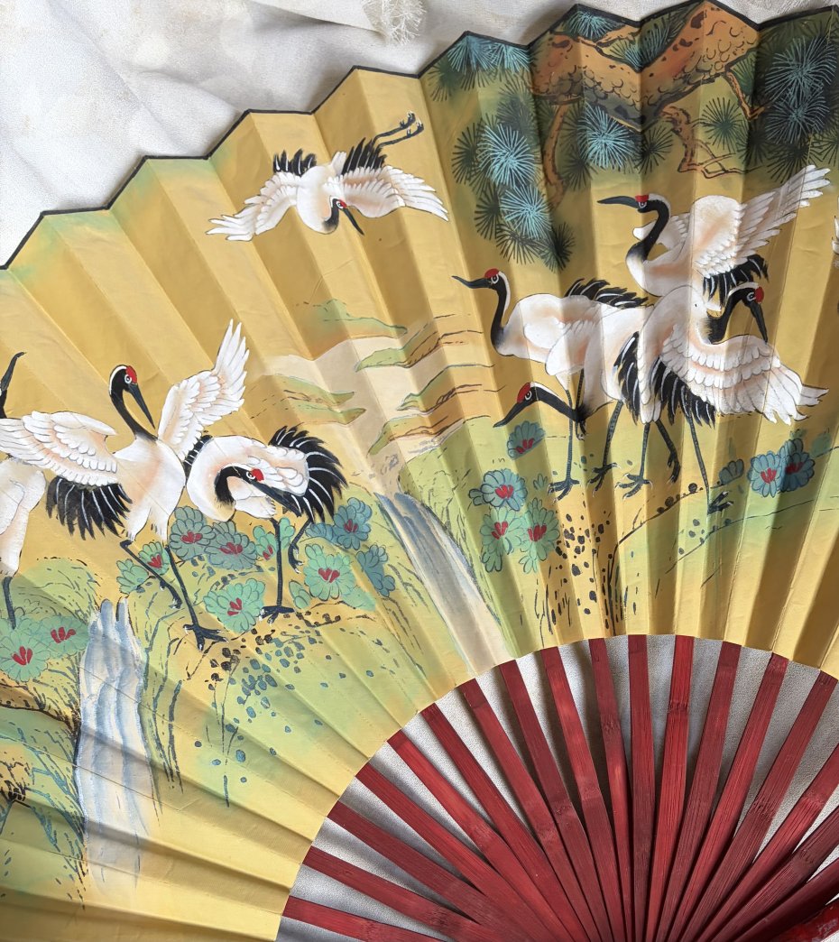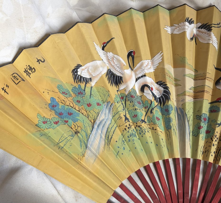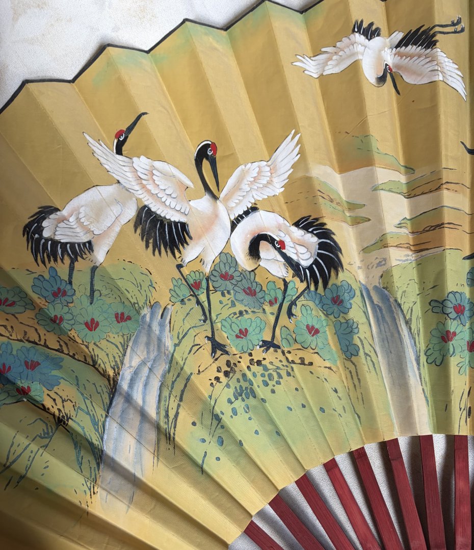 Wachlarz dekoracyjny do zawieszenia na ścianę . Ręcznie malowany na grubym papierze . Taniec żurawi:) Sygnowany . Drewniane elementy, haczyki i tasiemki do zawieszenie od tyłu . Wysokość 63,5 po złożeniu : 4,5 x 4,5 x 1,5 cm po rozłożeniu 102 cm . Stan zachowania dobry , drobne wady ręcznego wykonania i ślady przekładania na drewnianych elementach bocznych .