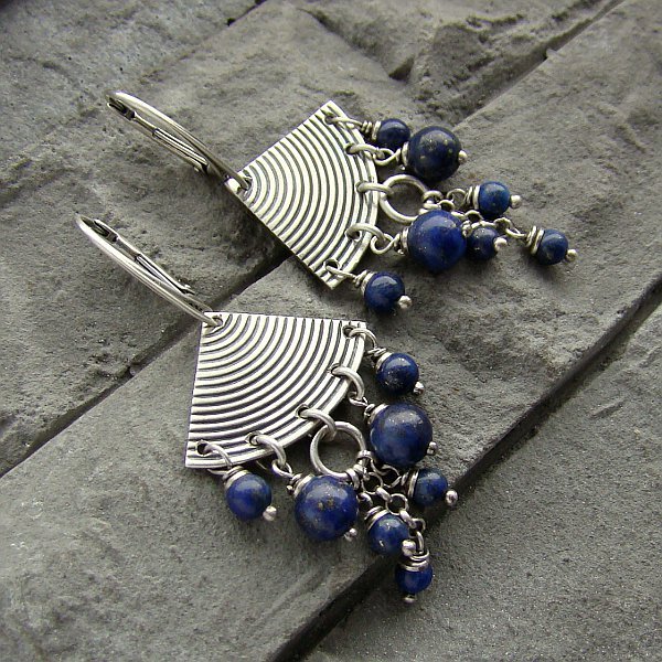 Efektowe i oryginalne kolczyki wykonane w całości z oksydowanego srebra próby 925 oraz kulek lapisu lazuli wielkości 4 i 6 mm. Rozpiętość kolczyków to 2,2 cm, a całkowita długość kolczyków to 5,2 cm. Ozdobnie zapakowane.