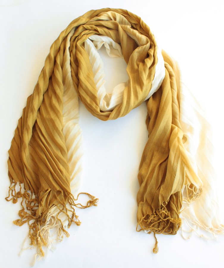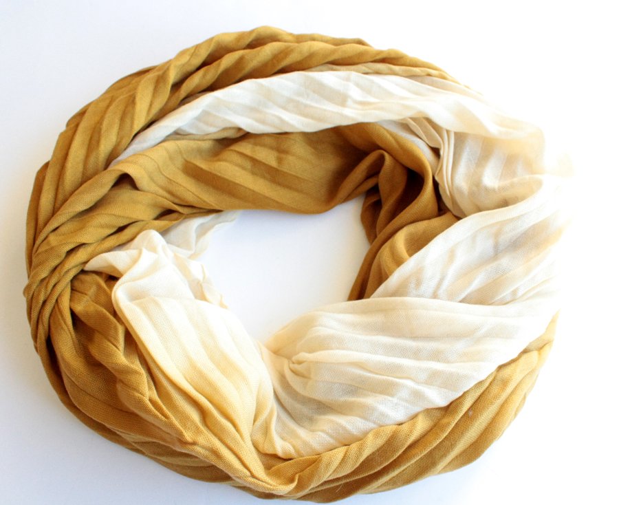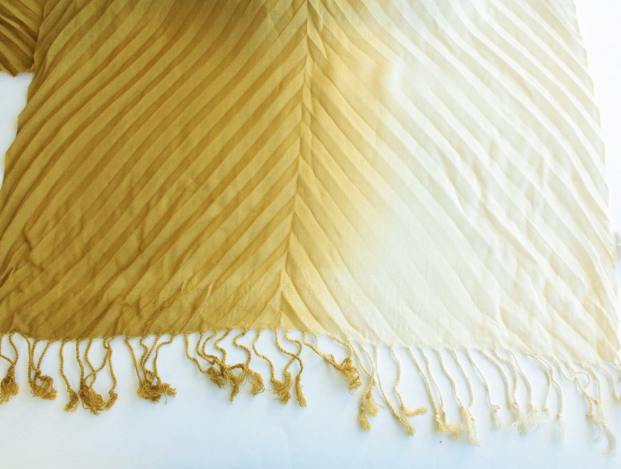 Duży szal o ciekawej, wachlarzowej strukturze. Plisy dzielą szal na pół pod względem kolorystycznym - jedna z części ma odcień kremowy, zaś druga to ciepła oliwkowa zieleń z dodatkiem miodu.