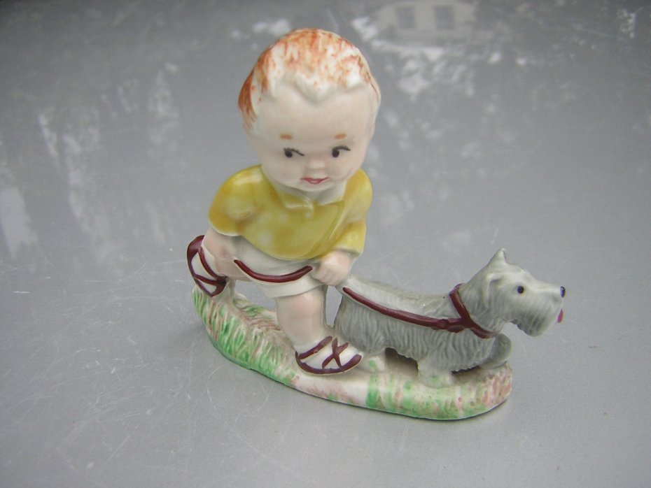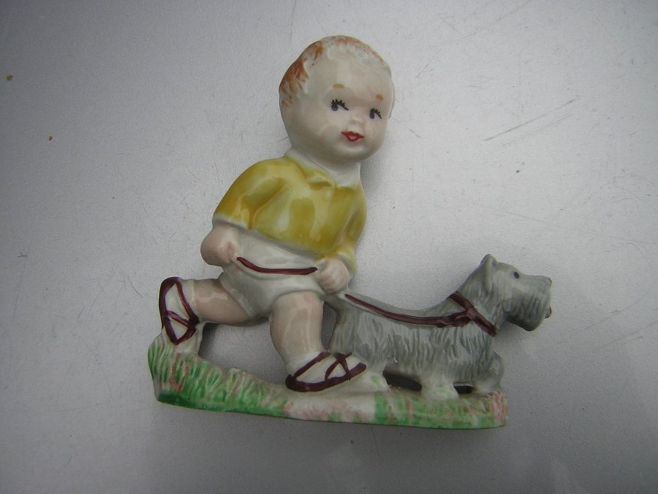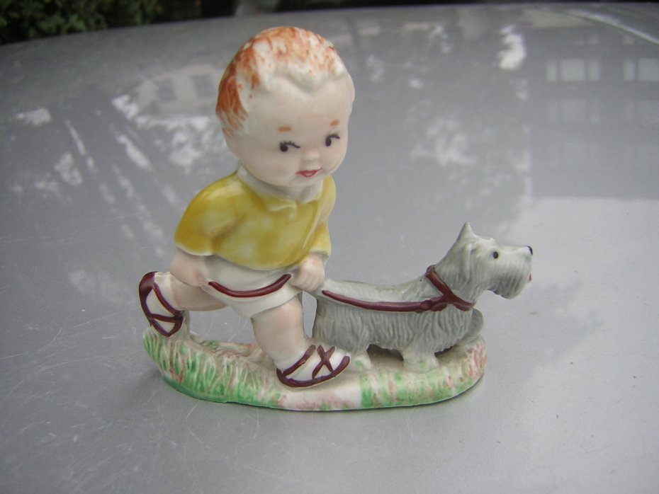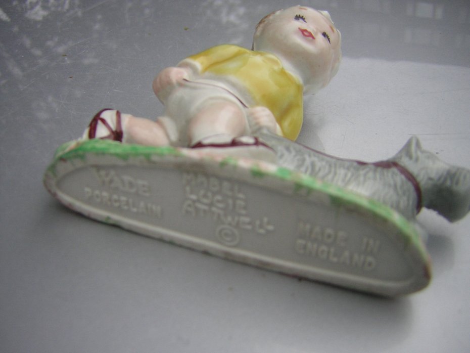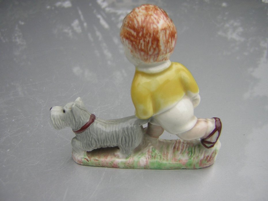 Kolekcjonerska porcelanowa figurka, sygnowana WADE PORCELAIN MABEL LUCIE ATTWELL MADE IN ENGLAND. Pochodzi z lat 1940 - 1956. Boy Sam with Schnauzer dog. Rzadko spotykana nie tylko na rynku polskim. Ciekawa również dlatego, że porcelanowa, ale ciężka, pełna, bez dziurek od spodu. Biegnący radośnie ze swoim pieskiem Sam w dawnej estetyki odsłonie. Ręcznie malowana, na błyszcząco wykończona. Wartość kolekcjonerska.