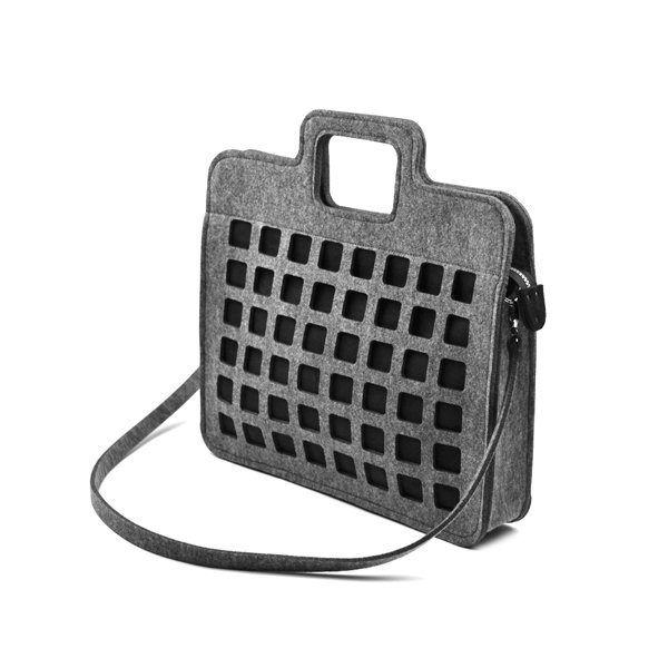kwadratowa torebka z szarego filcu z wyciętymi kwadracikami i czarną podszewką oraz wszytym bokiem