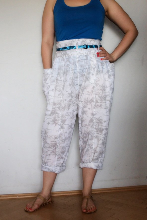 Letnie spodnie marki Mariposa, z wyższym stanem. Stan bardzo dobry. Materiał, wygląda jak cieniutka, drukowana bawełna (brak metki) bez podszewki. Ciekawe zapięcie z przodu na małe guziczki, duże nakładane kieszenie, nogawki szerokie górą, węższe na dole. Długość 3/4. Brak metki z rozmiarem, ale myślę, że powinny pasować na 38. Sprzedawany bez dodatków. Podaję wymiary mierzone na płasko;