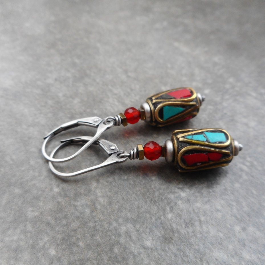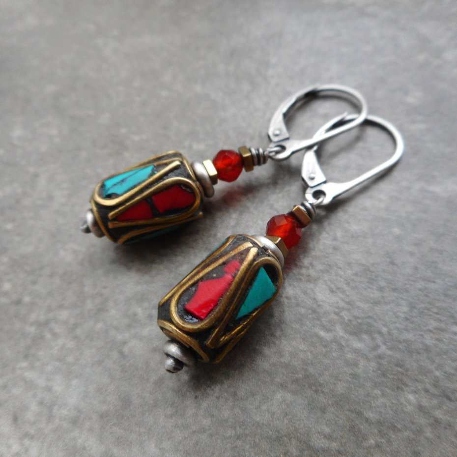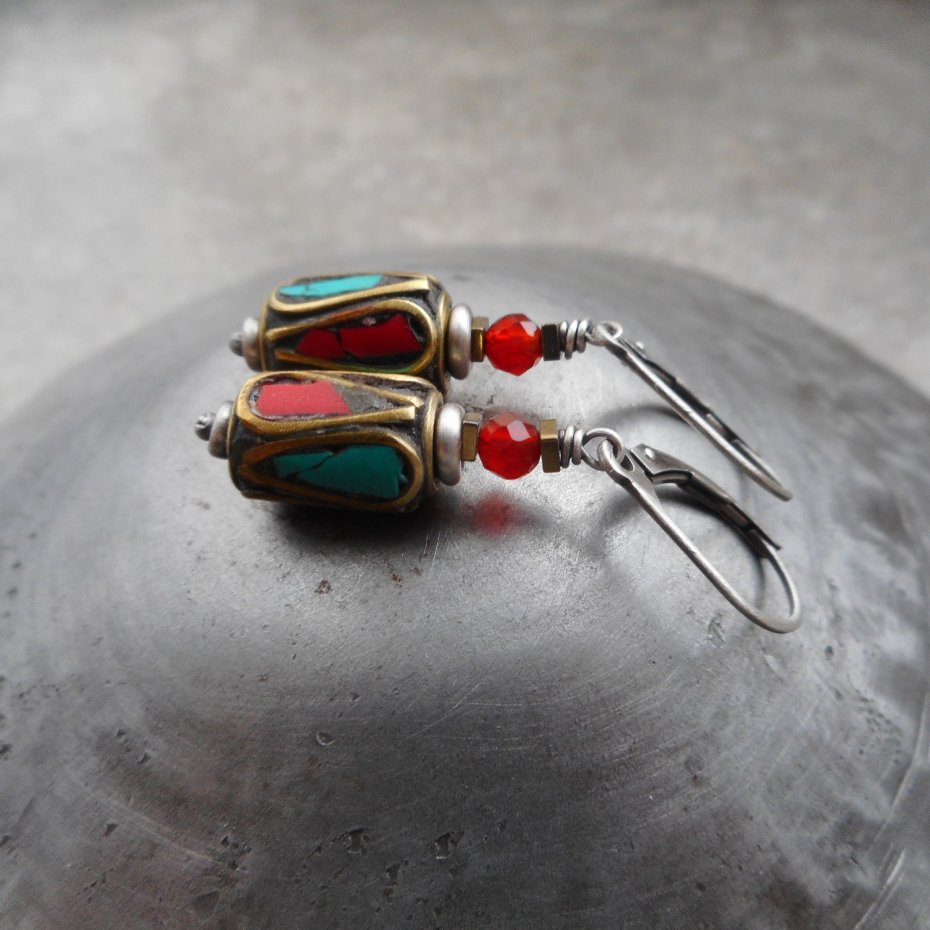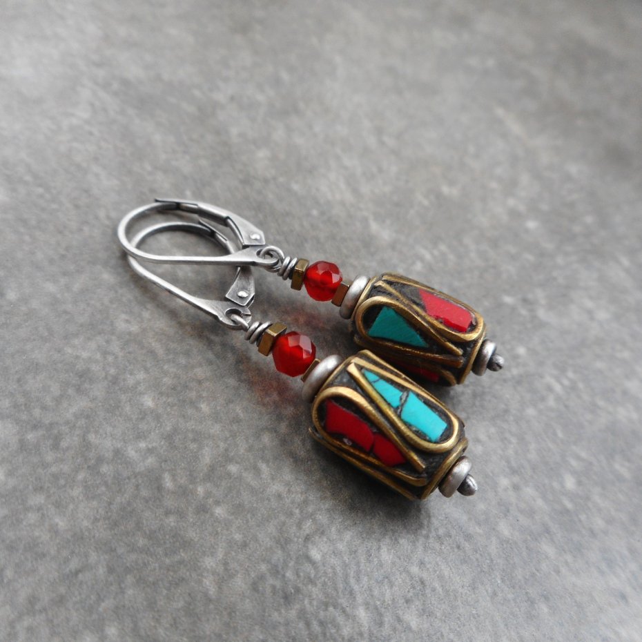 Kolczyki wykonane z kamieni naturalnych i szlachetnego srebra; oryginalne, w etnicznym stylu, z tybetańskimi mosiężnymi koralikami w kształcie walca, zdobionymi turkusem i koralem (10 mm)
