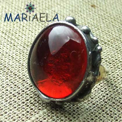 Ciemnoczerwony szklany kaboszon, osadzony w cynowanej, artystycznej ramie.