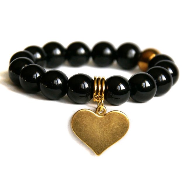 efektowna, okazała bransoletka wykonana z naturalnych kamieni (spore kule ONYKSU oraz złotego hematytu 12mm) oraz pięknej metalowej przekładki -duże serce, na solidnej elastycznej lince silikonowej.... ONYKS - Wzmacnia i regeneruje nerki. Łagodzi zaburzenia neurologiczne, apatię i stres. Wzmacnia system nerwowy. Dobrze działa na stan i wygląd skóry, zębów, paznokci i włosów. pomaga w skupieniu uwagi na najmniejszych detalach, ułatwia analizę faktów, dodaje cierpliwości i uczy samodyscypliny........ BRANSOLETKA PASUJE NA NADGARSTEK 15-16cm. POLECAM podobne do kompletu ;-)