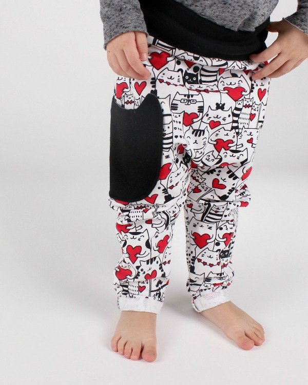 Spodnie z obniżonym krokiem (pumpy), kieszonka z boku w kształcie głowy kotka z uszami.