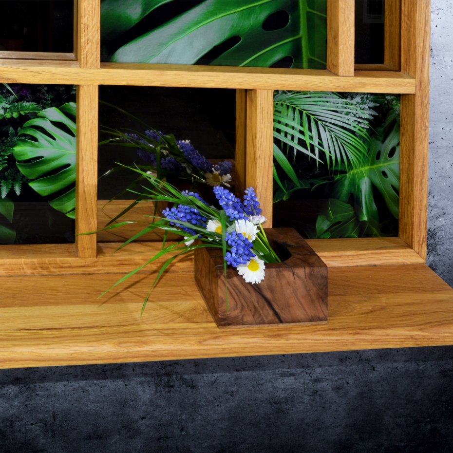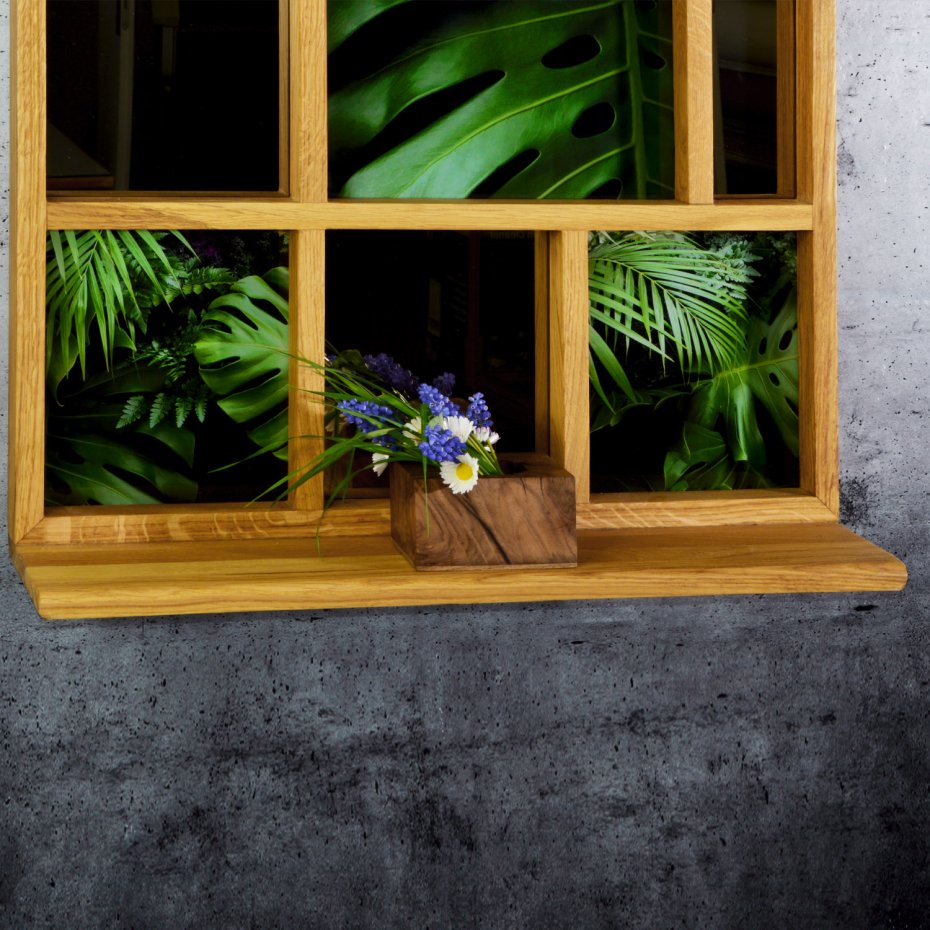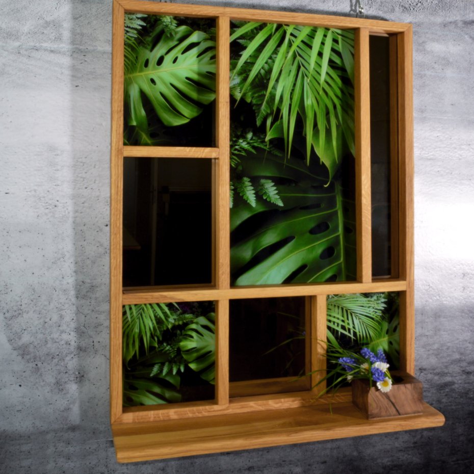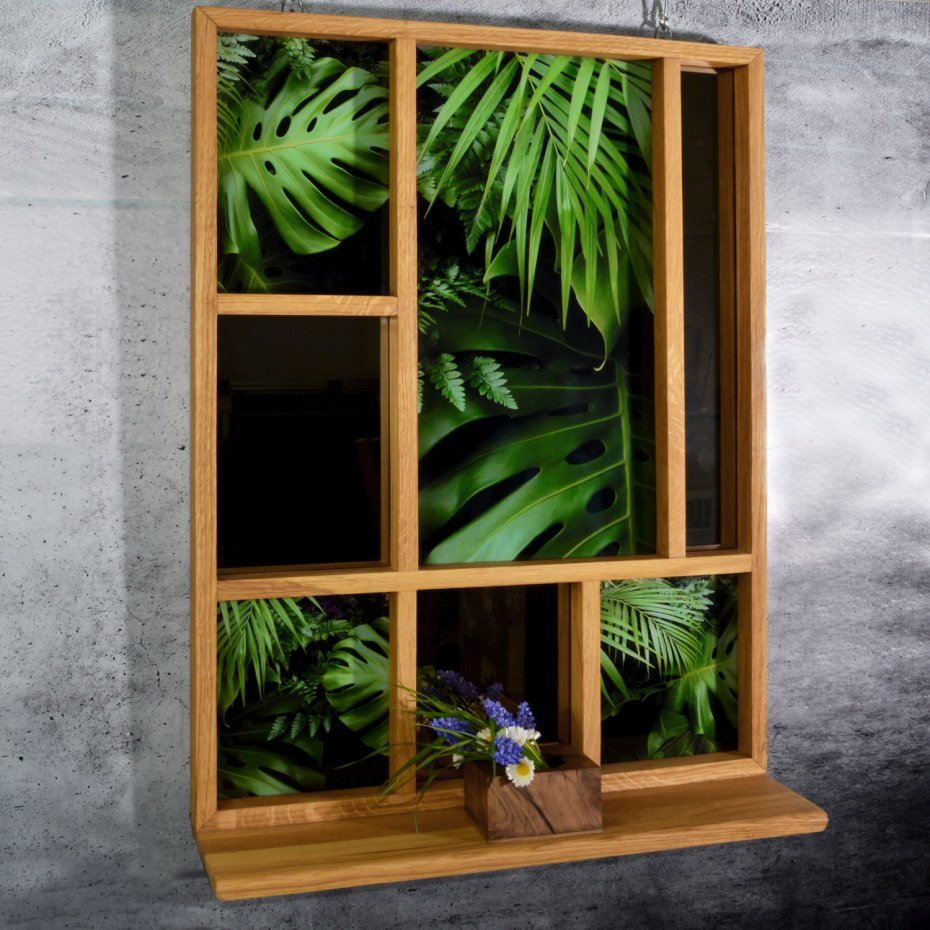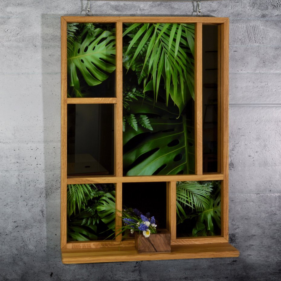Naturalne drewno dębowe, wykończone olejowoskiem, zachowuje swój autentyczny rysunek i ciepło. Podziały ramy porządkują przestrzeń, prowadząc wzrok między taflami szkła, refleksami lustra i graficzną kompozycją roślinną. Dolna półka rozszerza funkcję – pozwala na subtelną ekspozycję przedmiotów codziennych: ceramiki, szkła, roślin czy drobnych form użytkowych. To nie tylko dekoracja, ale tło dla rzeczy, które chcesz wyróżnić.