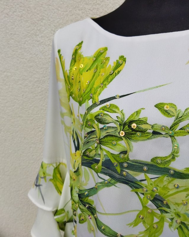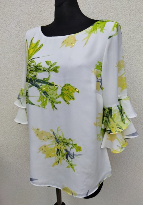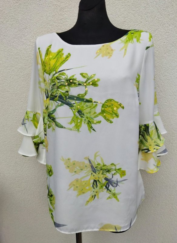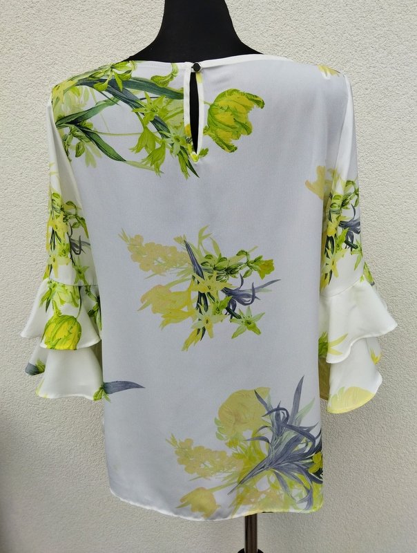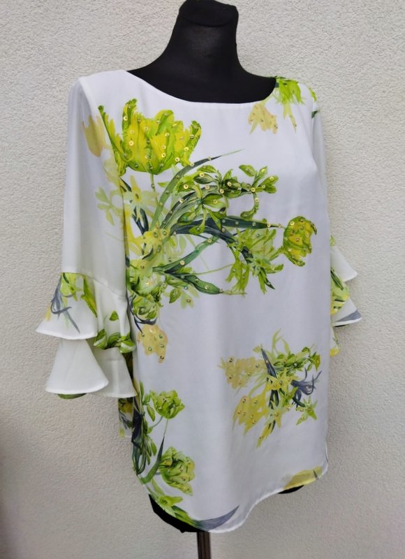 Ładna bluzka z poliestrowej tkaniny w tulipanowy wzór w żółto-zielonej kolorystyce na tle w kolorze mlecznej bieli. Owalny dekolt, rękawy z dwiema falbanami z półkola. Zapinana na plecach na mały guziczek. Na cienkiej podszewce.