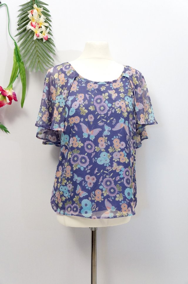 BLUZKA Z LEKKO PRZEŚWITUJĄCEGO MATERIAŁU 100 % POLIESTER. WEWNĄTRZ FIOLETOWA PODSZEWKA.
