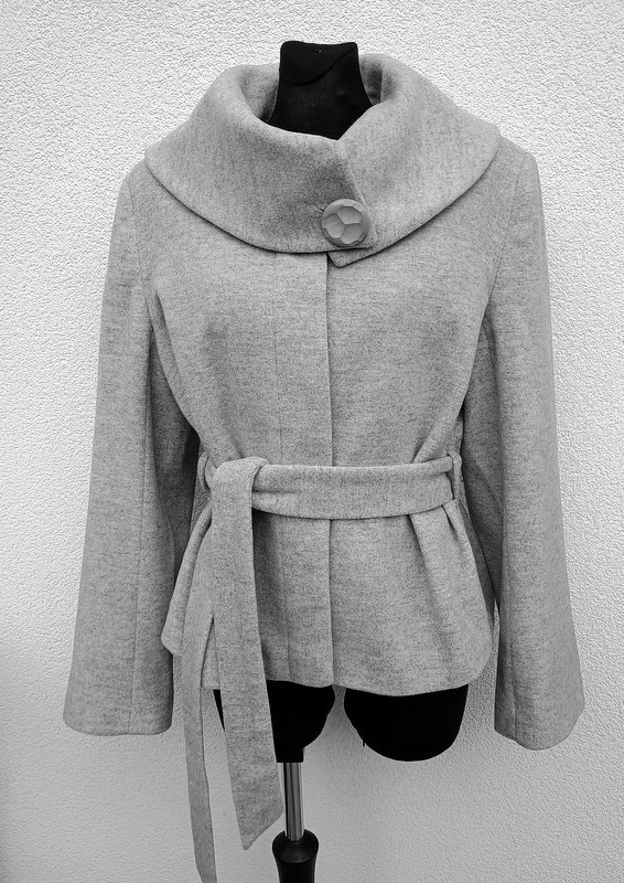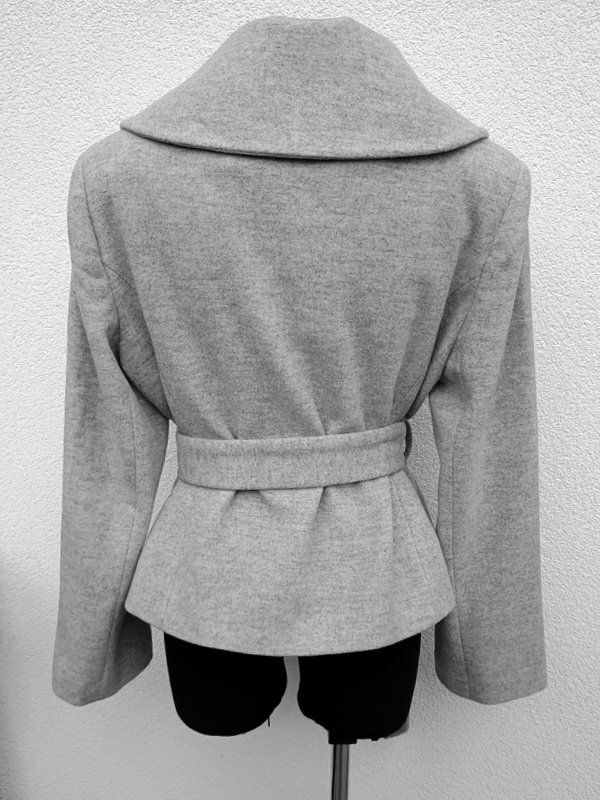 Dobrej jakości kurtka z wełnianej tkaniny z dodatkiem nylonu w jasnoszarym( gołębim ) kolorze. Z okazałym wykładanym kołnierzem zapinanym na jeden ozdobny guzik. Wiązana paskiem w talii. Zapinana od wewnątrz na ukryte pod plisą guziki . całość na podszewce.