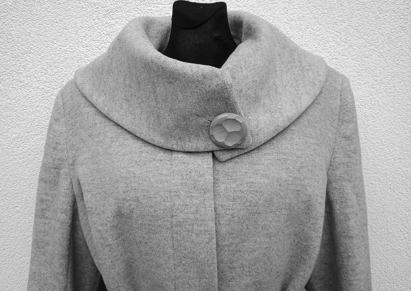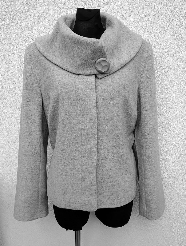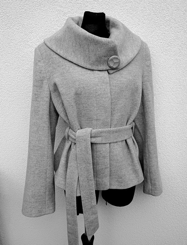 Dobrej jakości kurtka z wełnianej tkaniny z dodatkiem nylonu w jasnoszarym( gołębim ) kolorze. Z okazałym wykładanym kołnierzem zapinanym na jeden ozdobny guzik. Wiązana paskiem w talii. Zapinana od wewnątrz na ukryte pod plisą guziki . całość na podszewce.