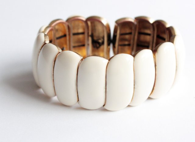 Kremowa bransoletka vintage pokryta emalią, od wewnętrznej strony w kolorze złotym. Bransoletka na gumce, rozmiar uniwersalny.