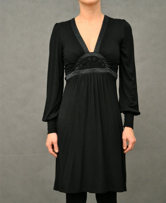 Czarna sukienka z dekoltem w szpic. Poniżej haftowana. Rękawy na ściągaczu. Polecam.