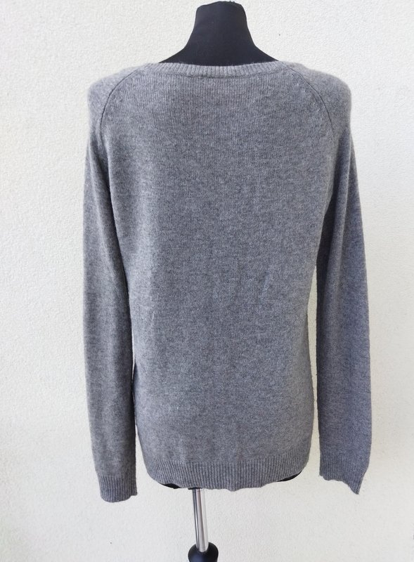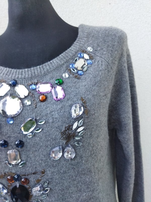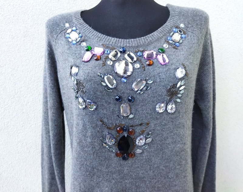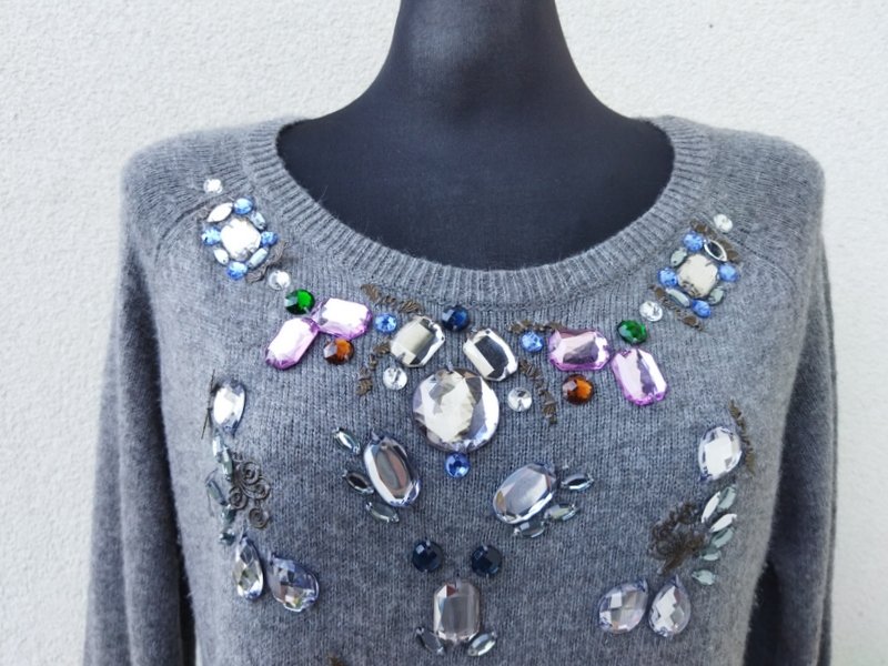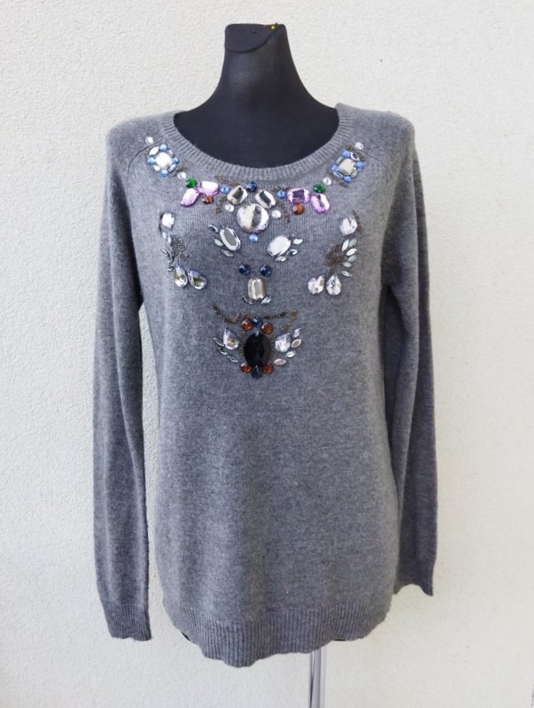 Miły, mięciutki, sweterek w jasnoszarym kolorze, zdobiony biżuteryjnymi kamykami. Owalny dekolt , rękawy raglanowe. wykończony ściagaczami. Podatny i rozciągliwy