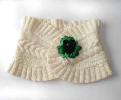 Szeroki kołnierz wełniany w kolorze ecru. Bez zapięcia, nalezy go spiąć broszką lub dużą agrafką (zielona broszka nie jest w sprzedaży). Szer. 25 cm, dł. 85 cm.