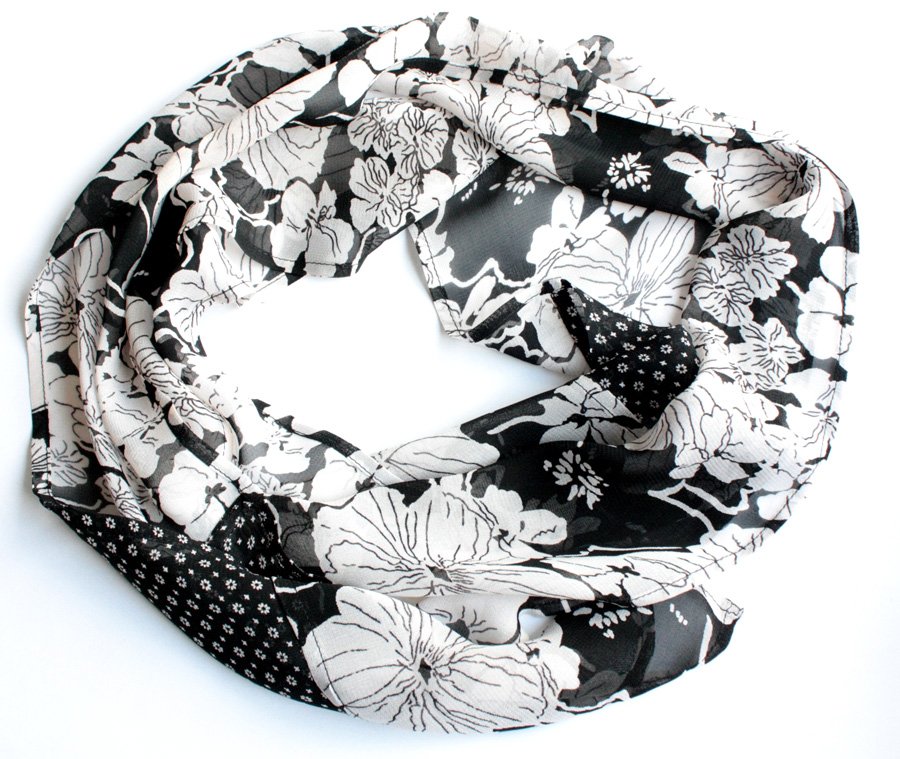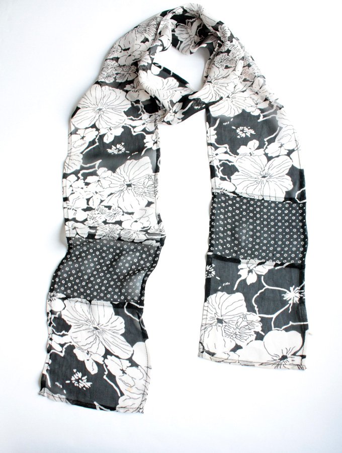 Zwiewny, długi szal vintage uszyty z różnych materiałów o tej samej strukturze. Materiał oceniam na wiskozę.