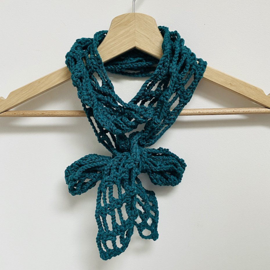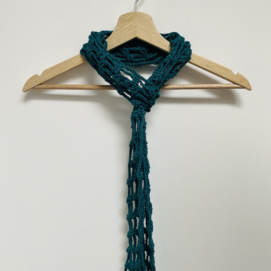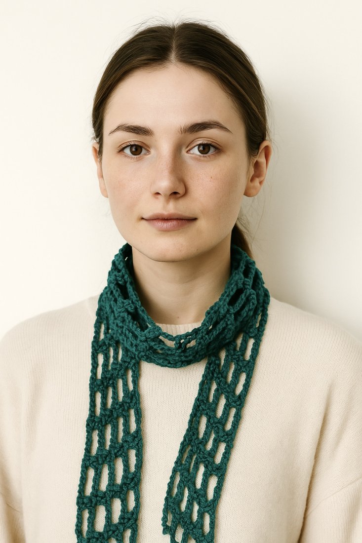 Ażurowy, siatkowy wzór nadaje mu ciekawego charakteru, a odpowiednia długość pozwala na różne sposoby stylizacji – możesz owinąć go wokół szyi, nosić jak naszyjnik, opaskę lub delikatny akcent do letnich i jesiennych stylizacji.