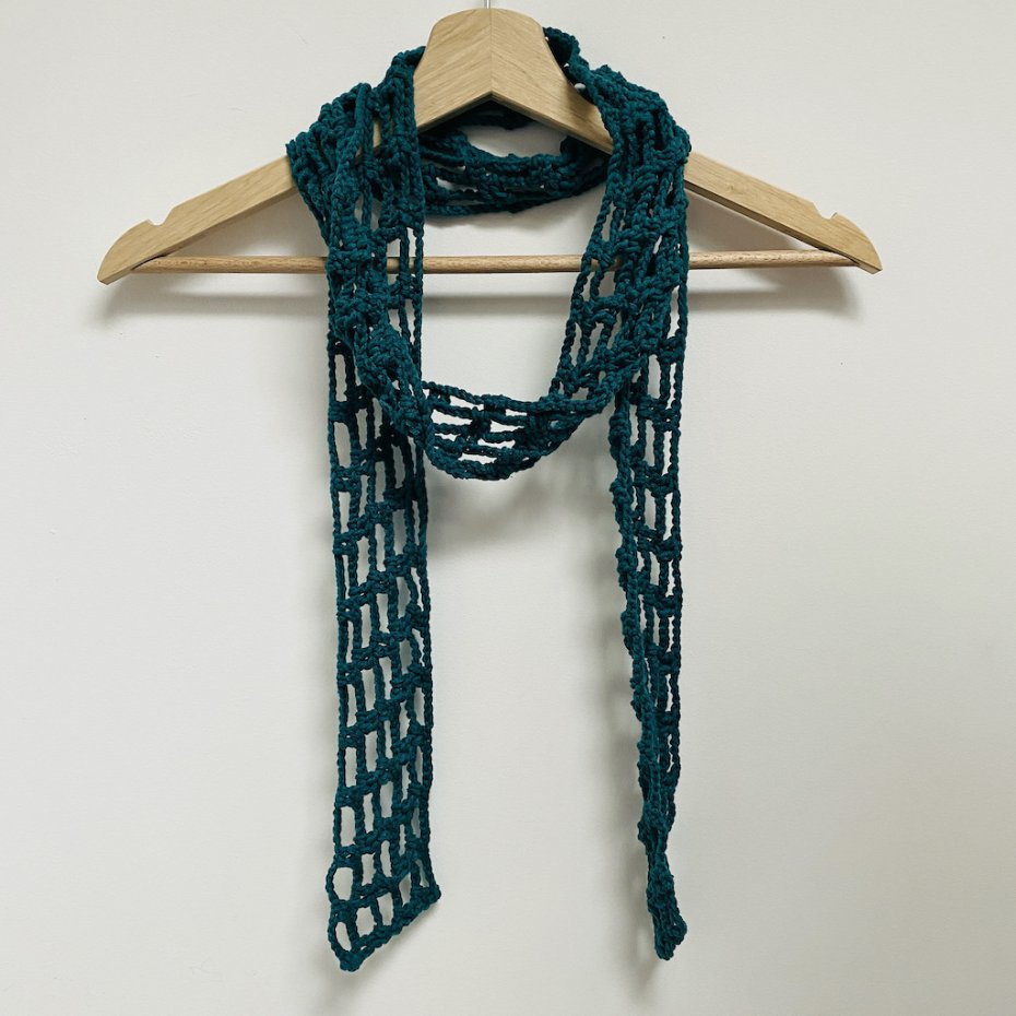 Ten wąski szalik wykonałam ręcznie na szydełku z wysokiej jakości włóczki bawełniano-akrylowej, przyjemnej w dotyku i delikatnie elastycznej.