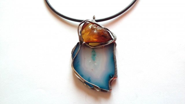 Wisiorek wykonany z miedzi, cyny, agatu, bursztynu. Wymiary ok. 7 na 4 cm. Czarna linka kauczukowa o długości ok. 45 cm.