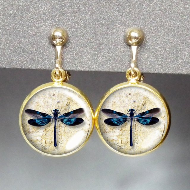 Eleganckie, małe wiszące klipsy z oryginalną grafiką artystyczną, zatopioną pod szkiełkiem, w oprawie w kolorze złota. Urocze, nieduże, delikatne klipsy. Hipoalergiczne.