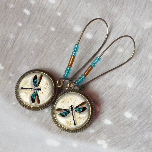 Kolczyki wiszące z oryginalną grafiką zatopioną pod wypukłym szkiełkiem dającym efekt trójwymiarowości i oprawioną w bazę w kolorze antycznego złotego brązu. Grafika jest najwyższej jakości, wyraźna i nasycona. Bigle hipoalergiczne, duże, zapinane z wklejonymi szklanymi koralikami w kolorze turkusowym i szklanymi rurkami w kolorze brązowo-złotym. Biżuteria bez niklu i ołowiu.
