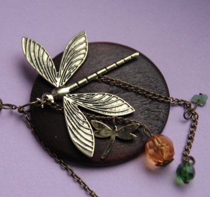 Piękny naszyjnik składający się z drewnianego krążka, zielonych i miodowych koralików, dużej ważki i 2 małych. Długość łańcuszka: 70 cm, w tym 13 cm zdobnego, podwójnego łańcuszka (widoczny na zdjęciu). Całość utrzymana w kolorystyce starego złota