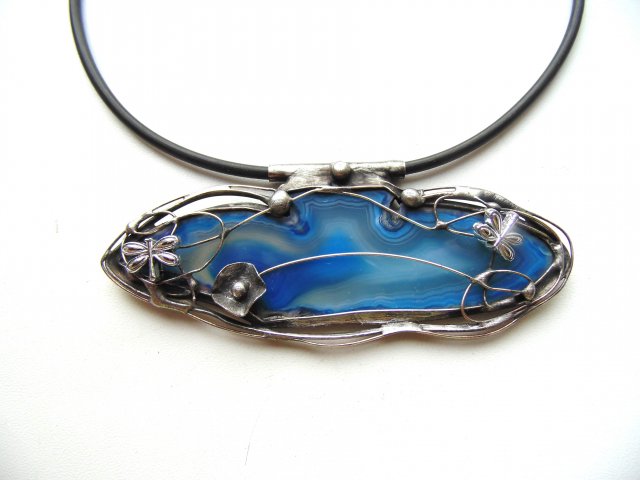 Wisiorek wykonany techniką witrażową z miedzi, cyny i agatu. Zawieszony na czarnej lince kauczukowej o długości ok. 45 cm. Wymiary ok. 4 na 9,5 cm.