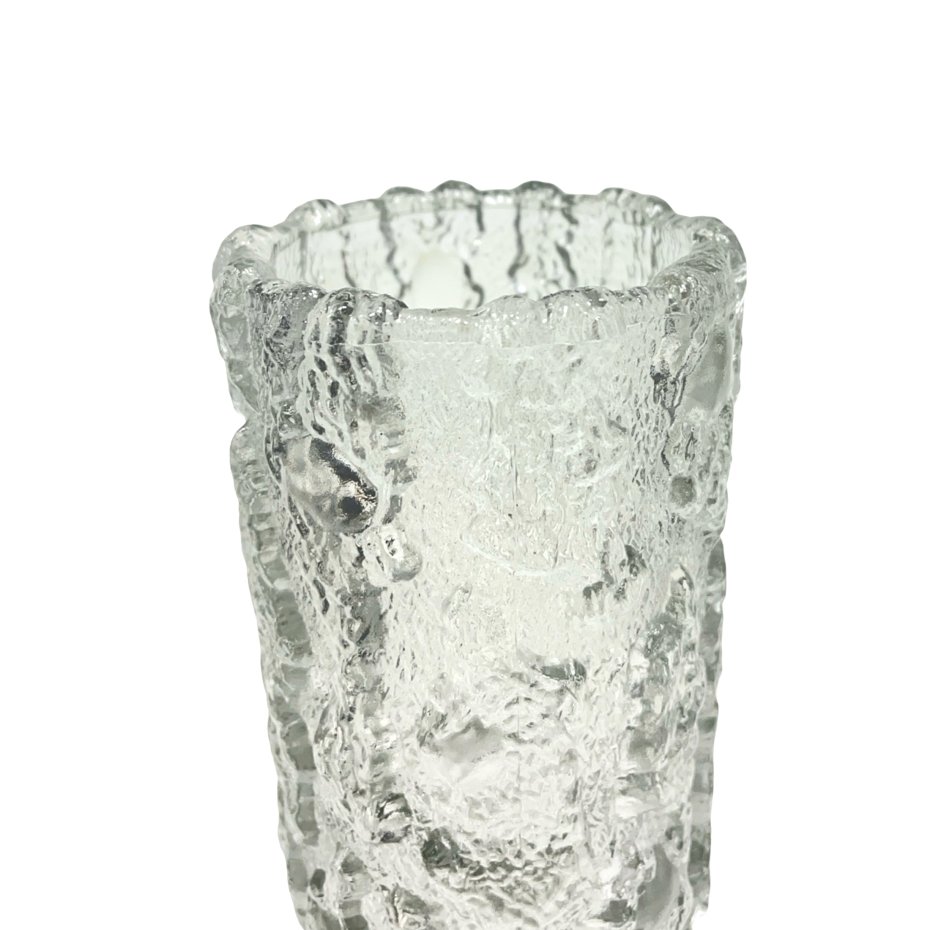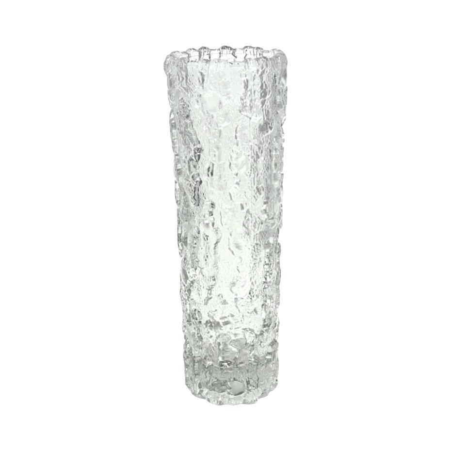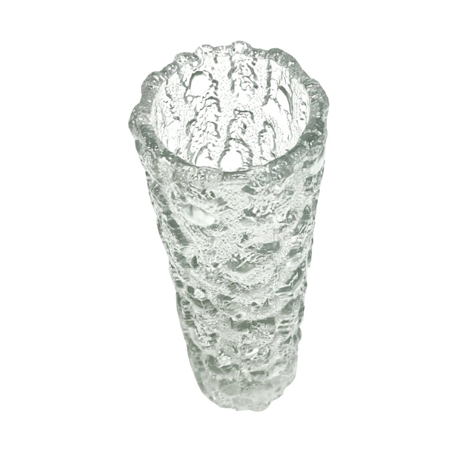 Wazon charakteryzuje się masywną, cylindryczną formą wykonaną z grubościennego, bezbarwnego szkła prasowanego. Jego unikalna struktura typu "Ice-Bark Glass" (szkło przypominające korę drzewa lub bryłę lodu) tworzy nieregularną, fakturowaną powierzchnię, która w efektowny sposób rozprasza i załamuje światło. Ze względu na surową, rzeźbiarską formę, przedmiot stanowi wyrazisty element dekoracyjny zarówno w nowoczesnych, jak i klasycznych wnętrzach.