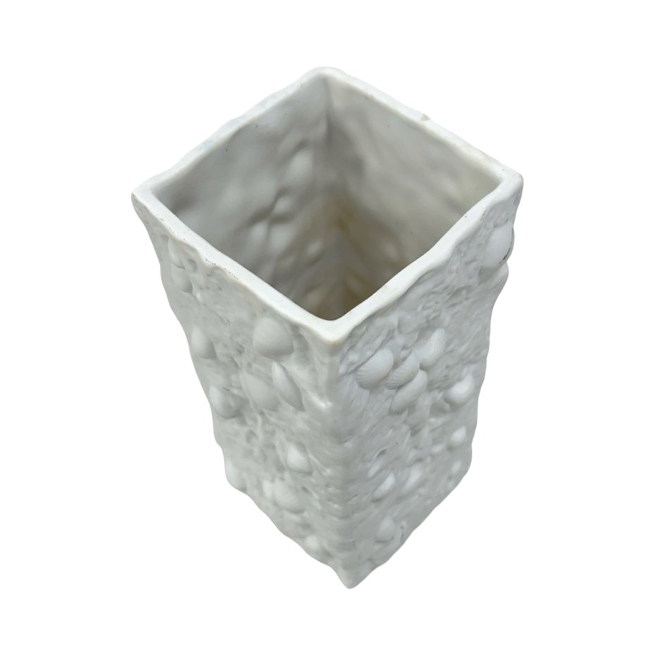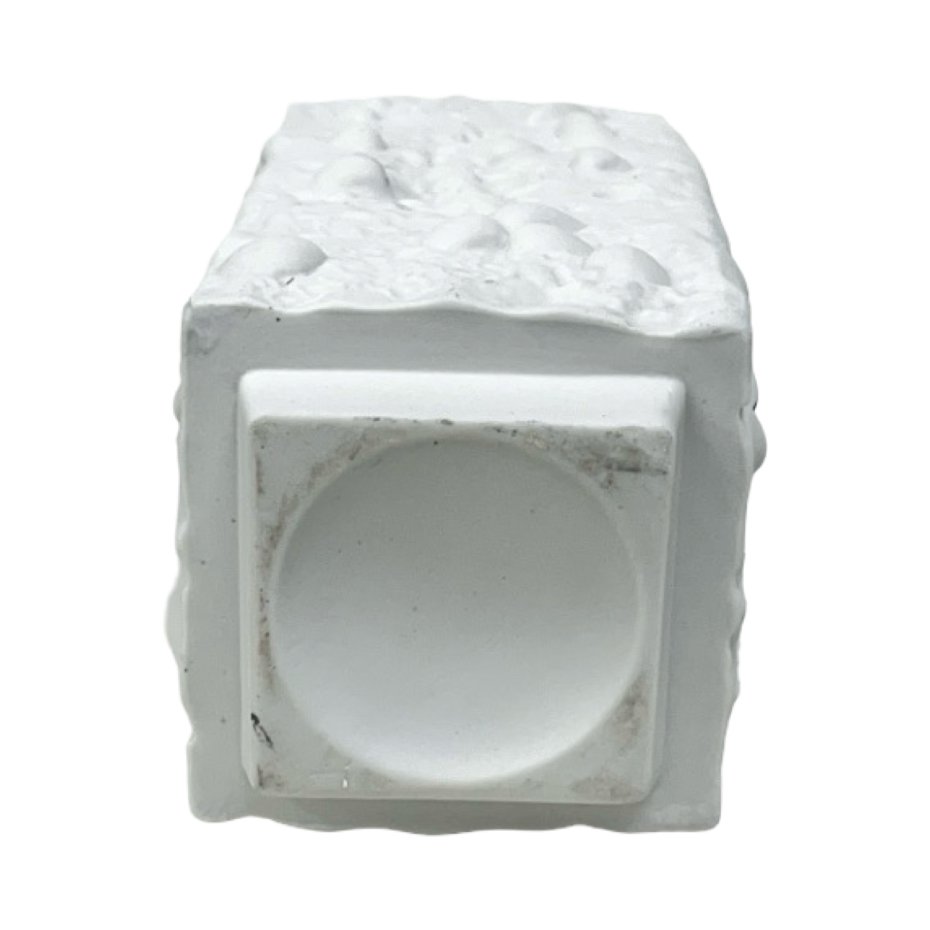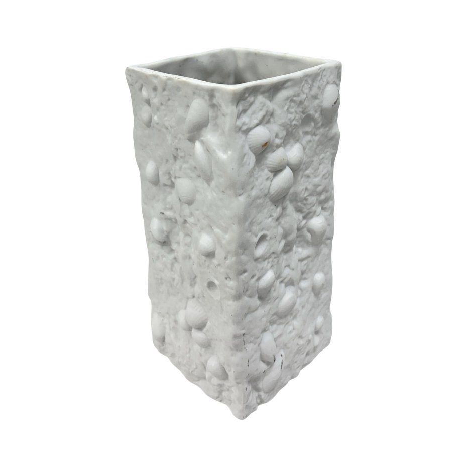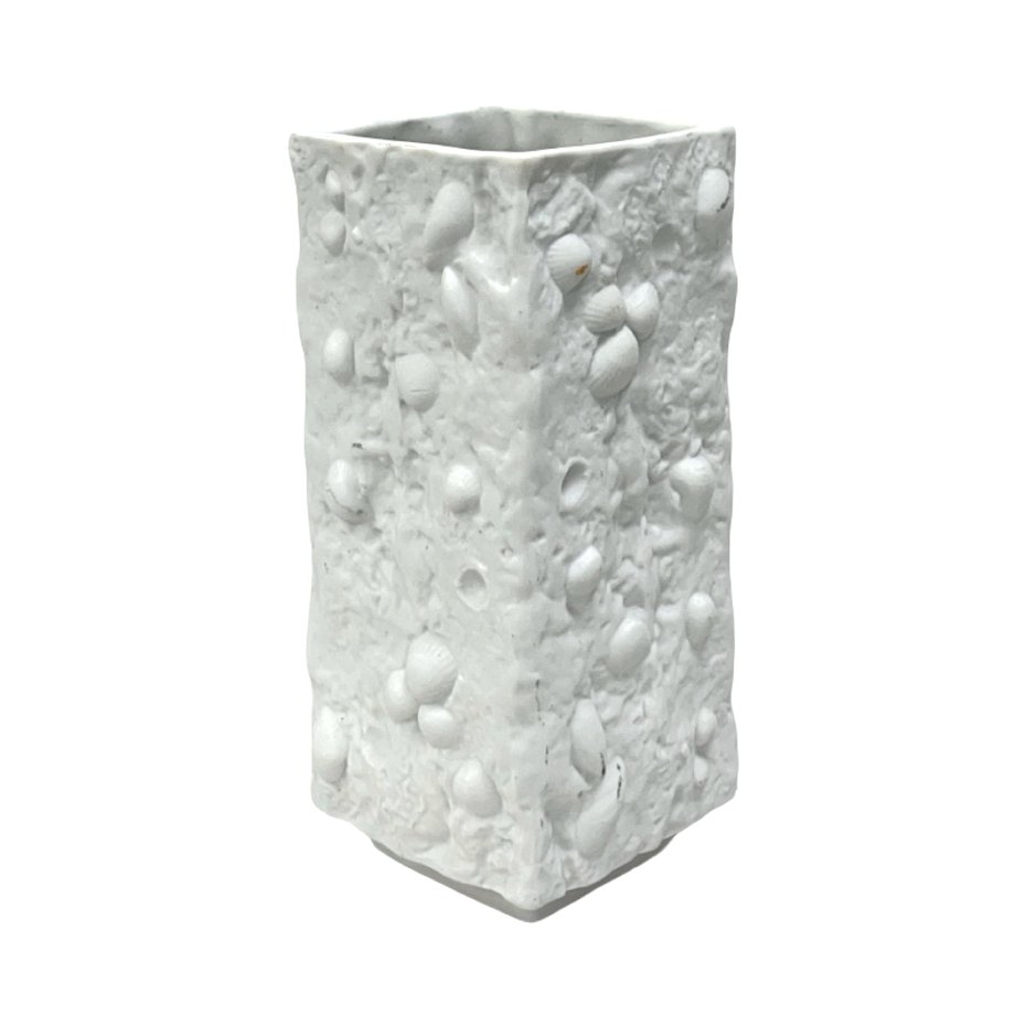 Wazon wyróżnia się unikalną, organiczną strukturą typu relief. Powierzchnia ścianek ozdobiona jest wypukłymi motywami inspirowanymi naturą – skamielinami, muszlami morskimi oraz amonitami. Surowa, matowa faktura biskwitu w połączeniu z geometryczną formą prostopadłościanu to kwintesencja stylu Op-art oraz modernistycznego wzornictwa z ery Space Age.