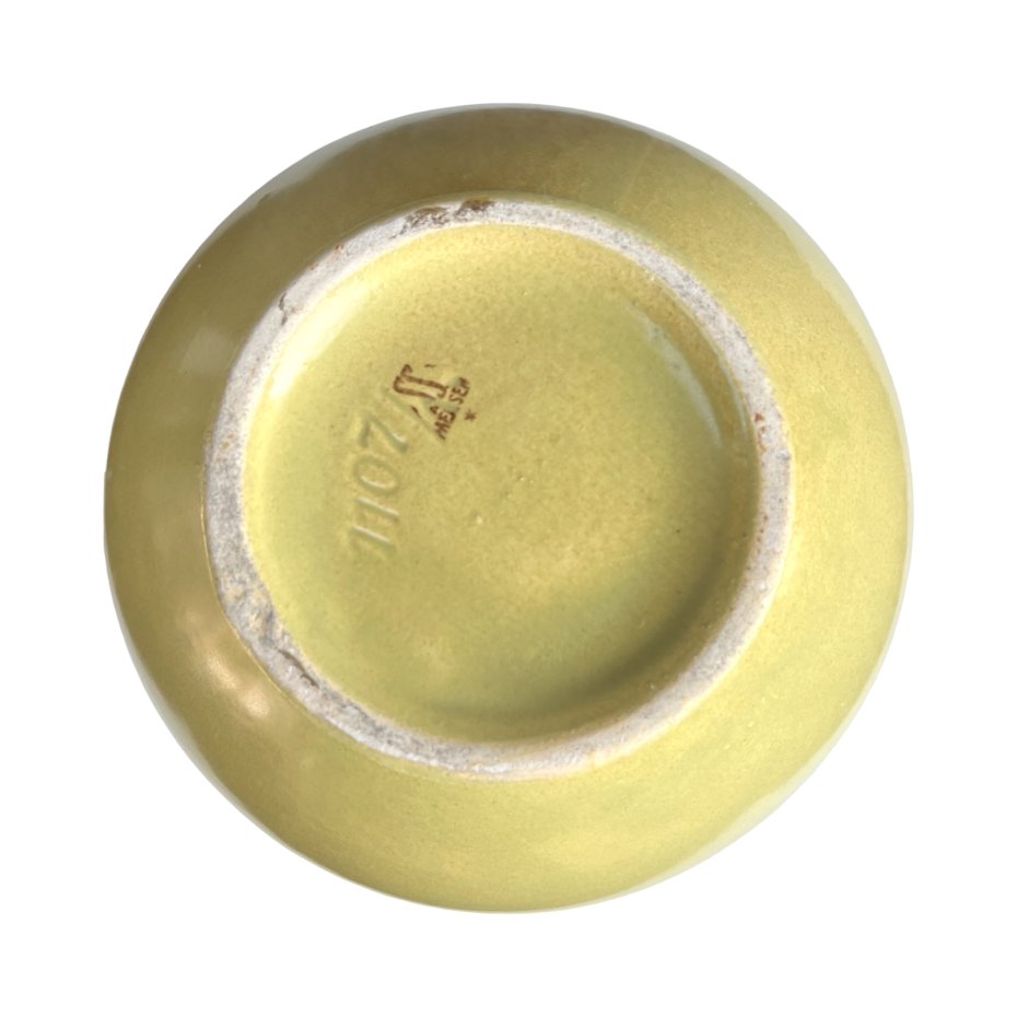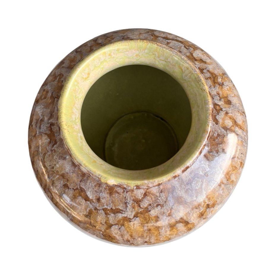 Ceramika o klasycznej, kulistej formie z delikatnie rozchyloną szyjką, pokryta efektownym, ręcznie nakładanym szkliwem krystalicznym typu drip glaze. Górna partia naczynia utrzymana w tonacji brązowo-miodowej, przechodzi subtelnie w dolne, jasnożółte pole, tworząc wyjątkowy efekt spływających szkliw.