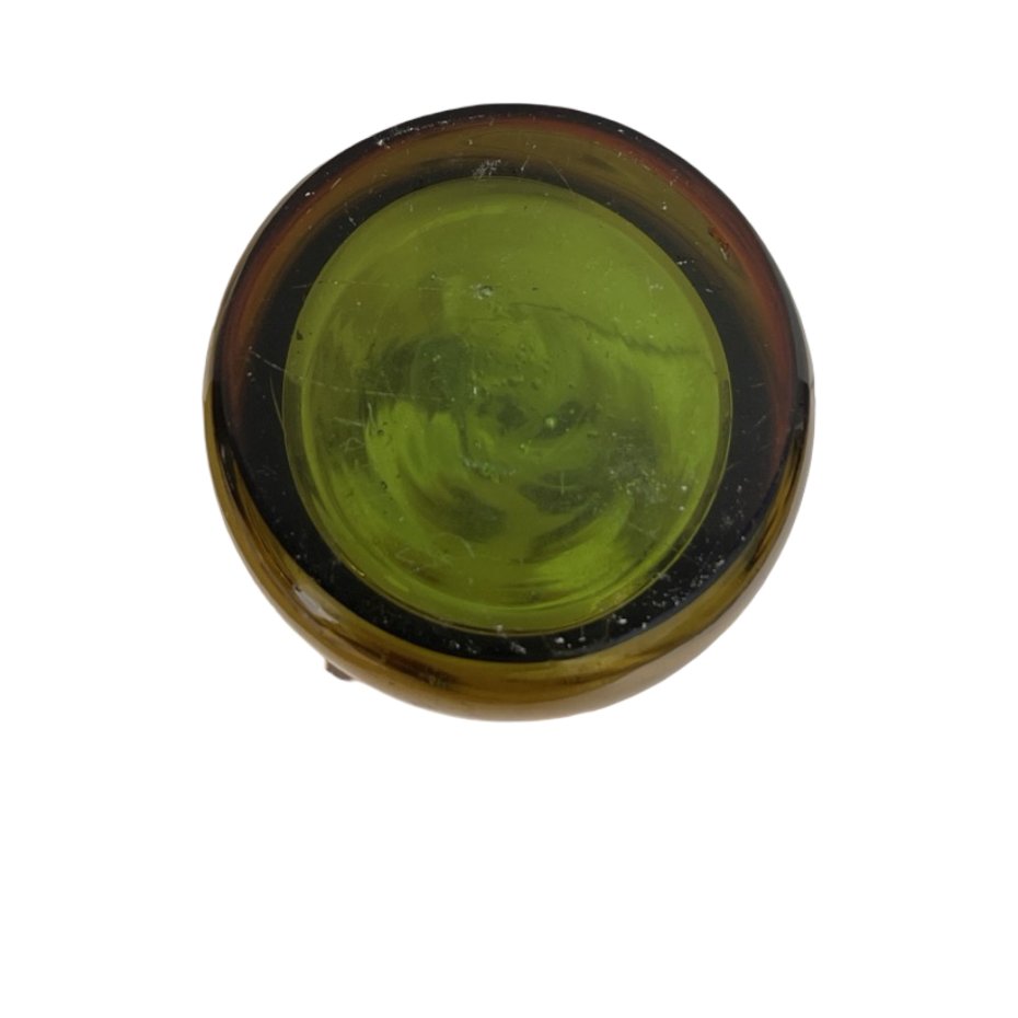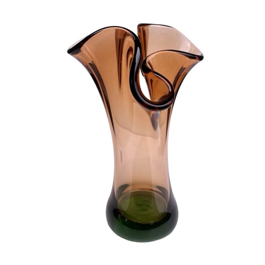 Model wykonany ze szkła w odcieniach brązu i zieleni, o organicznej, falującej formie i miękkiej linii wylotu — charakterystycznej dla czeskiego designu epoki mid-century.