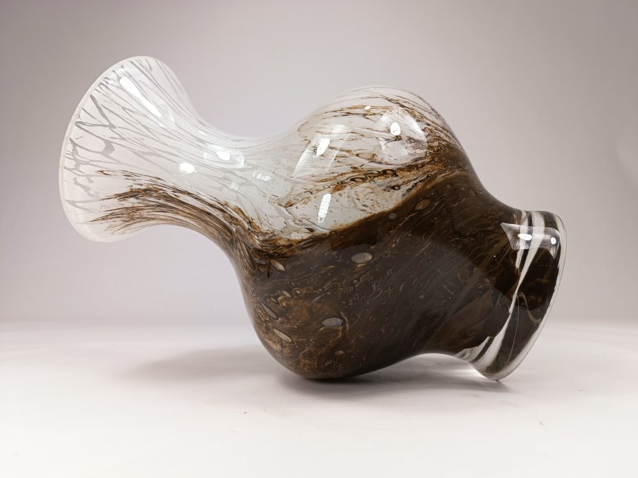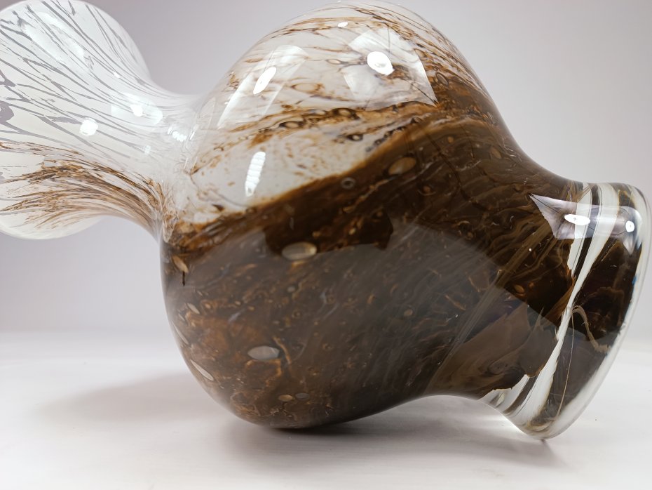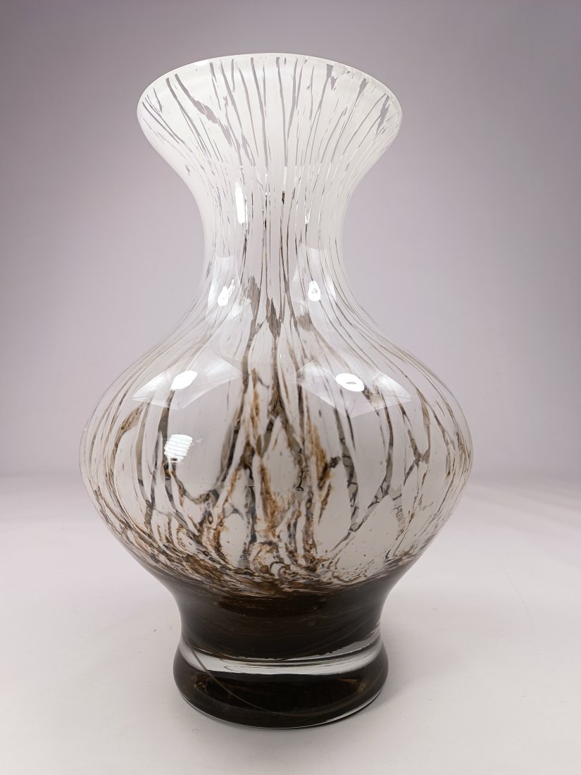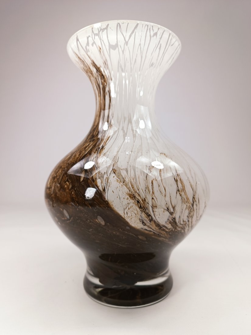Wazon wykonany z ciężkiego szkła Murano Marmorglas. Charakteryzuje się biało-brązowym wzorem, przypominającym marmur. Wysokość 28 cm. Stan zachowania bardzo dobry, bez uszkodzeń.