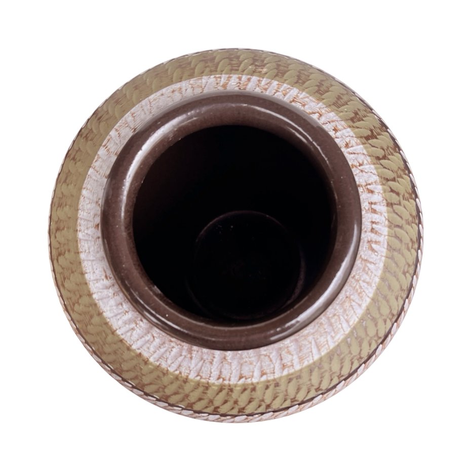 Efektowny wazon podłogowy z lat 60./70. XX wieku, wyprodukowany przez renomowaną niemiecką manufakturę Dümler & Breiden. Model w stylu Faux Klinker, charakterystyczny dla epoki mid-century modern — o fakturowanej powierzchni i geometrycznym układzie pasów w odcieniach beżu, żółci, brązu i oliwki.