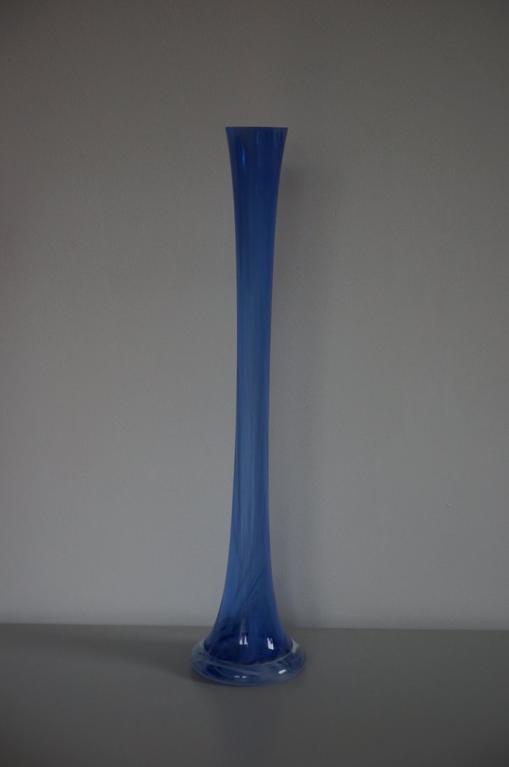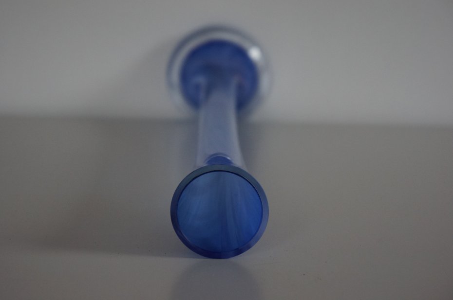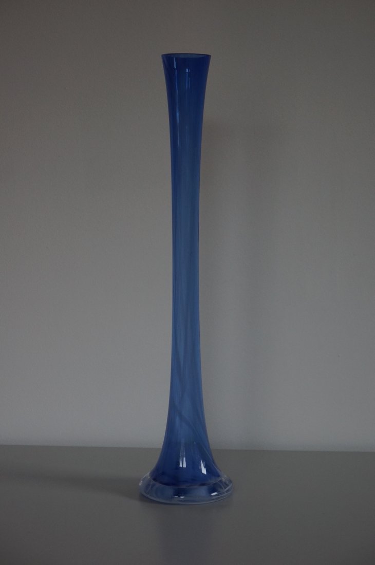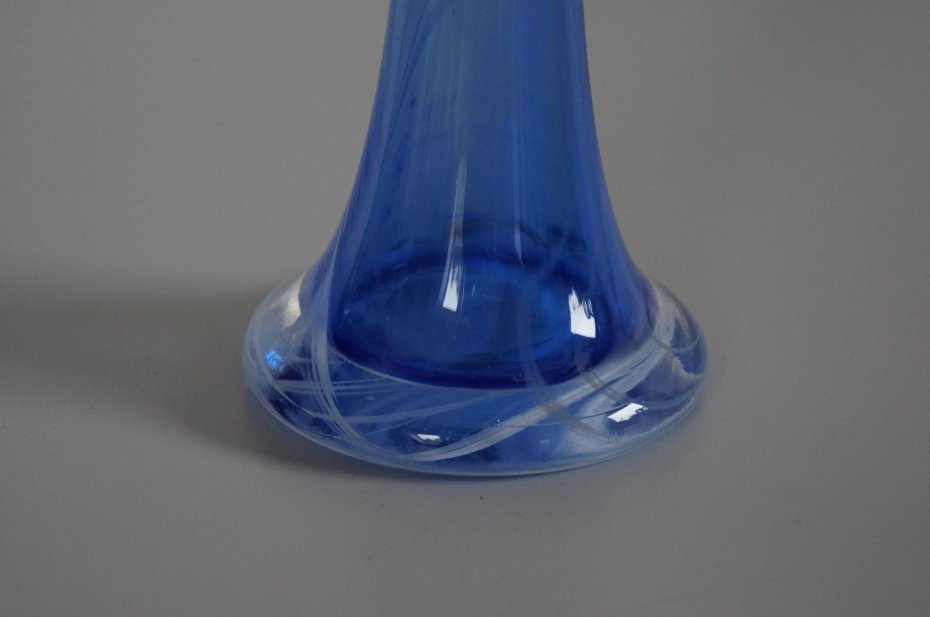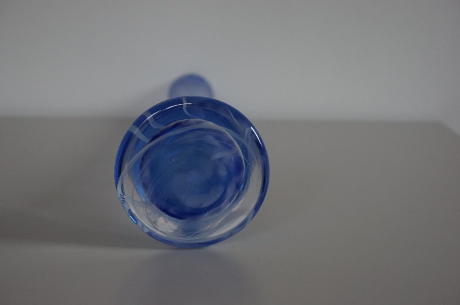 Piękny, wysoki wazon z grubego, barwionego szkła. Wazon posiada urocze cieniowania w różnych odcieniach koloru niebieskiego. Kształt smukły, prosty i klasyczny, przez co doskonale prezentują się w nim długie, pojedyncze kwiaty. Stan bardzo dobry.