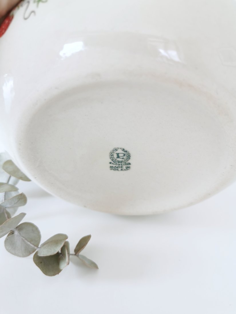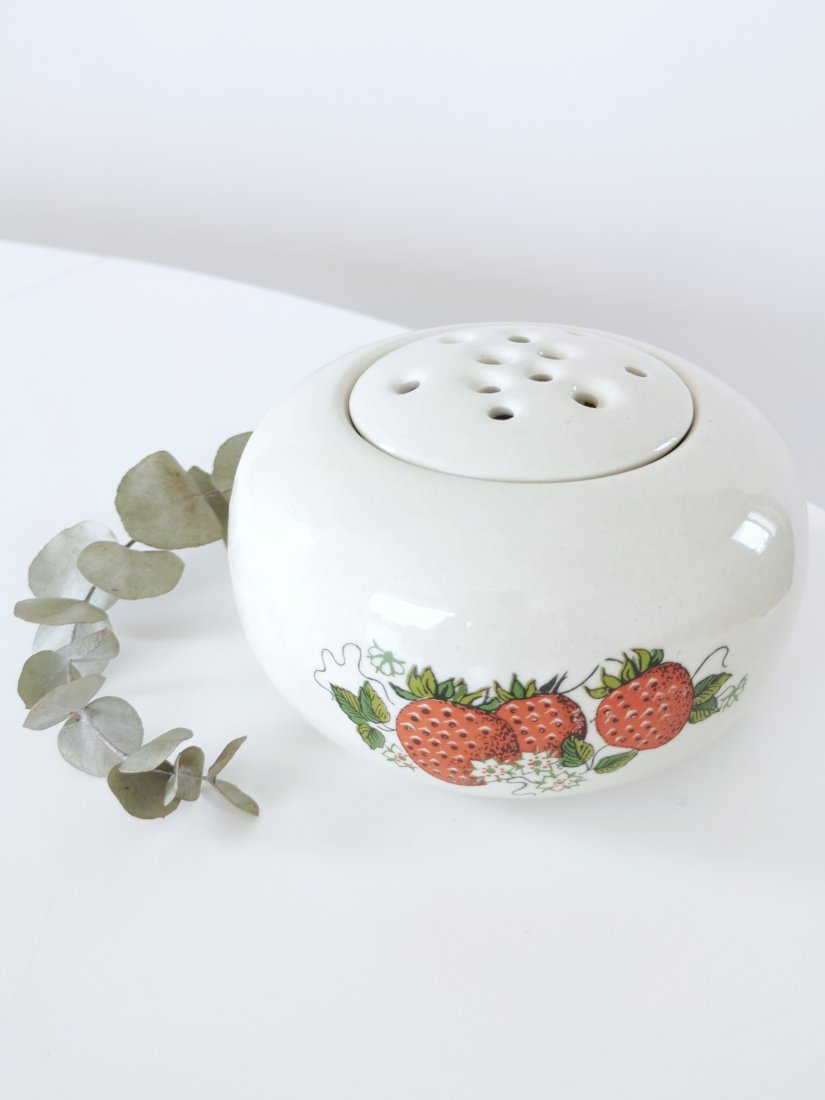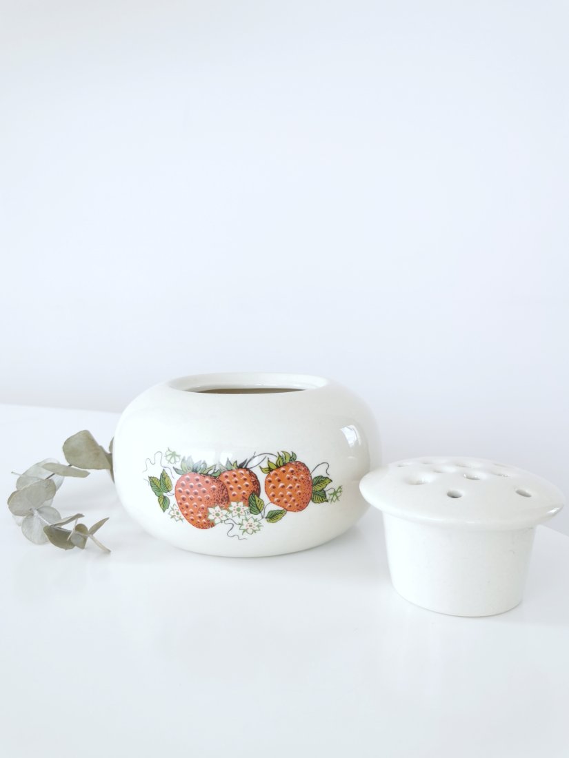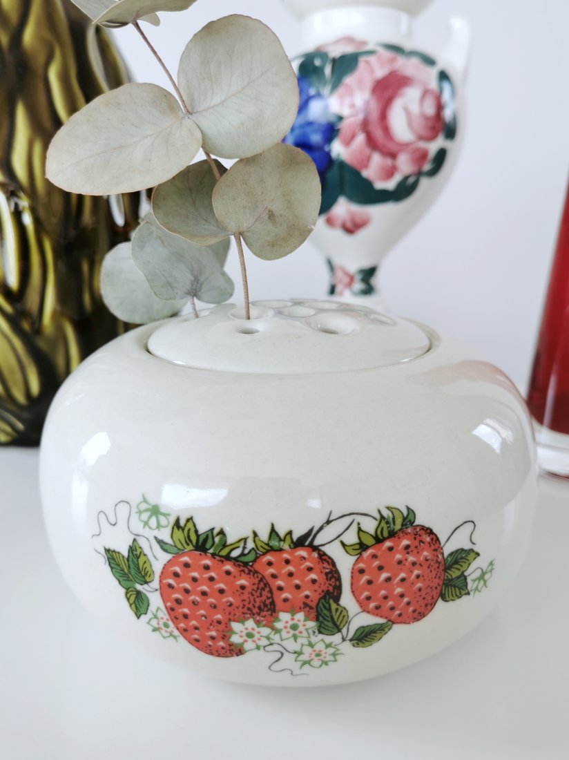 Wazon ceramiczny z wkładem do ikebany zdobiony trwałymi kalkomaniami w truskawki.