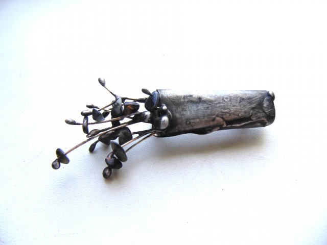 Broszka wykonana z miedzi, cyny i turmalinów. Zapięcie metalowe. Wymiary ok. 6,5 na 2 cm.