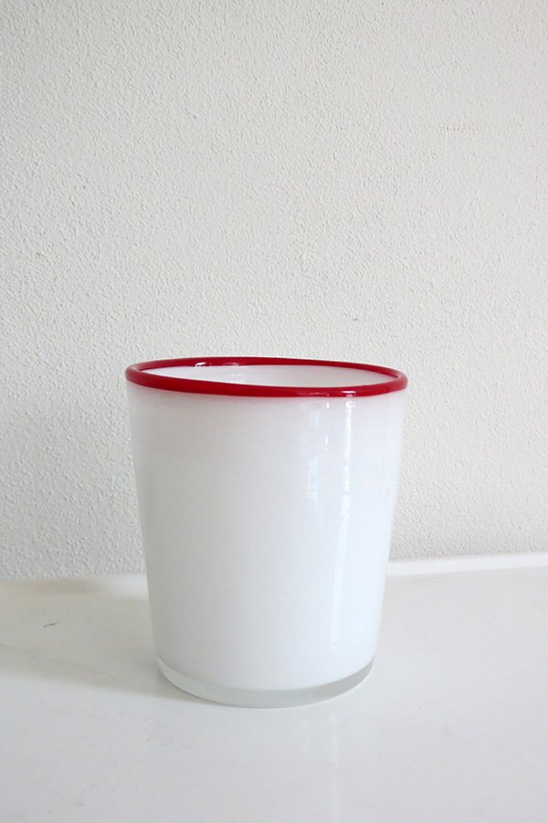 Mały wazonik ręcznie formowany ze szkła, w kolorze białym, bordowy brzeg.